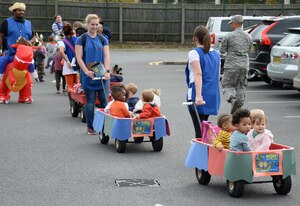 Team Mildenhall children take part in a parade during a Fall Festival Oct. 28, 2016, at the child development center on RAF Mildenhall, England. Children of all ages and their parents took time to come together to celebrate fall. (U.S. Air Force photo by Gina Randall)
