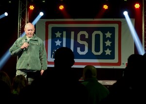 Among stars of the entertainment world, Gen. Martin E. Dempsey, 18th Chairman of the Joint Chiefs of Staff, greeted members of RAF Mildenhall, RAF Lakenheath and their families during a USO Holiday Tour Dec. 10, 2014, on RAF Mildenhall, England."[It's really an honor] to be here during the holiday