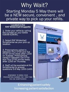 A new prescription dispensing machine is scheduled to be up and running May 5, 2014 in the shoppette here.The machine, called a ScriptCenter, will allow Team Mildenhall members to call the48th Medical Group pharmacy to order a prescription refill, then log in and pick up their prescriptions without