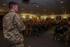 Oct. 12, 2021 100th ARW Commander's call U.S. Air Force Col. Gene Jacobus, 100th Air Refueling Wing commander, speaks at his first commander’s call at Royal Air Force Mildenhall, England, Oct. 4, 2021. Jacobus spoke to Airmen about the mission, his expectations and readiness.