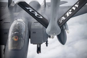 A U.S. Air Force KC-135 Stratotanker assigned to the 100th Air Refueling Wing, RAF Mildenhall, England, refueled F-15s assigned to the 48th Fighter Wing, RAF Lakenheath, England, during Exercise Valiant Liberty off the coast of England, March 5, 2020. Valiant Liberty is an agile combat employment