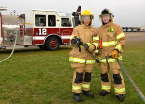 U.S. Air Force Chief Master Sgt. Kristina Rogers, left, 100th Air Refueling Wing command chief, poses for a photo with Airman 1st Class Adam Strizak, 100th Civil Engineer Squadron firefighter, before participating in Class A structural live-fire training at RAF Mildenhall, England, Jan. 24, 2019.