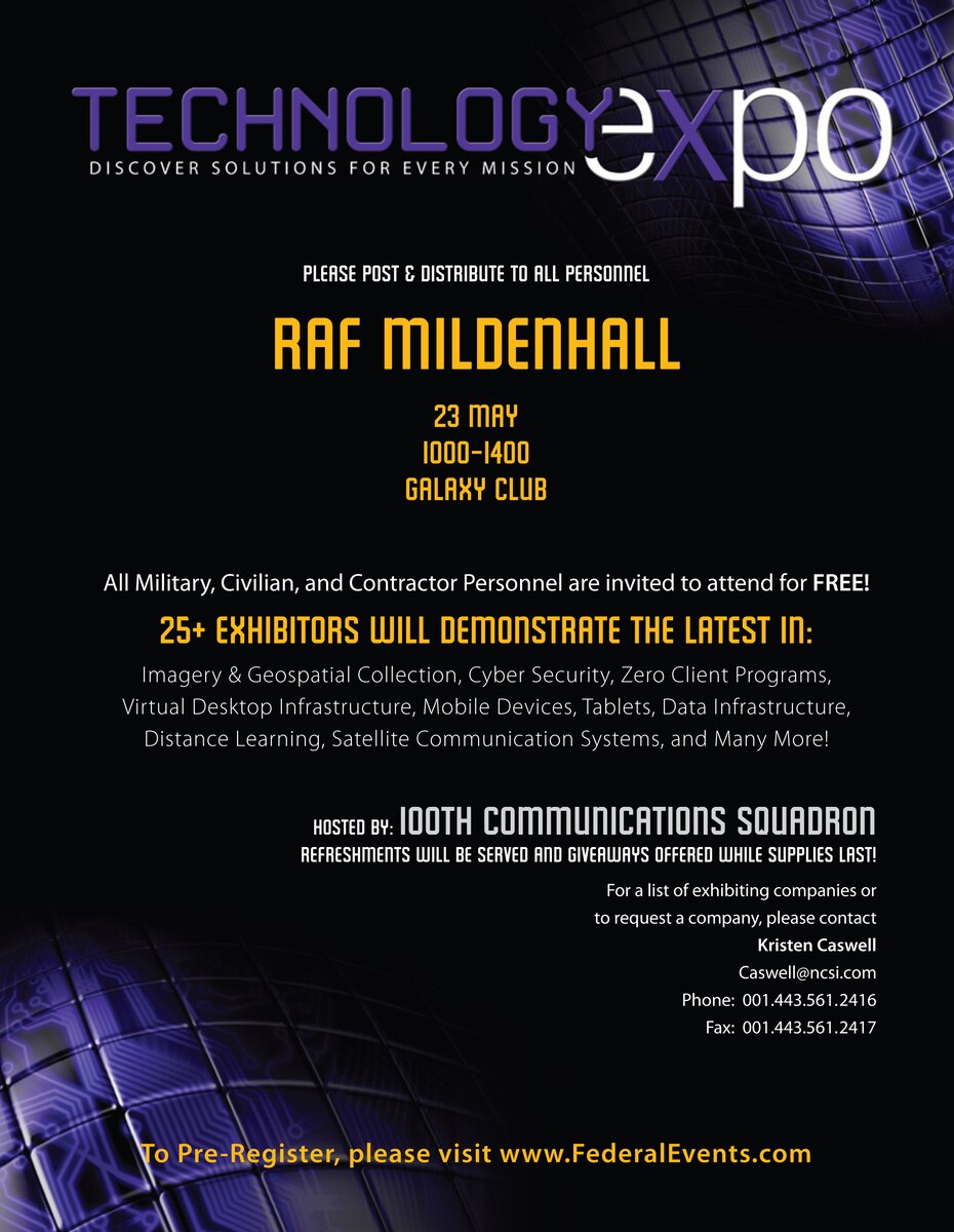 Expo showcases new technology Published May 21, 2013 By Staff Reports 100th Air Refueling Wing Public Affairs RAF MILDENHALL, England -- The 100th Communications Squadron is scheduled to host a Technology Expo May 23, 2013, in the Galaxy Club on RAF Mildenhall, England. Running from 10:00 a.m. to 2:00 p.m., the exposition showcases technology from more than 25 exhibitors including cyber security, mobile devices and tablets. Open to all military, civilian and contractor personnel, the event is free to attend and includes refreshments and giveaways throughout the exposition. The event offers Team Mildenhall members a chance to view and interact with the latest technologies, as well as supplies information about career alternatives to service members who are separating or considering it. For more information, contact Kristen Caswell at commercial 001-443-561-2416. To pre-register for the event, visit www.federalevents.com.