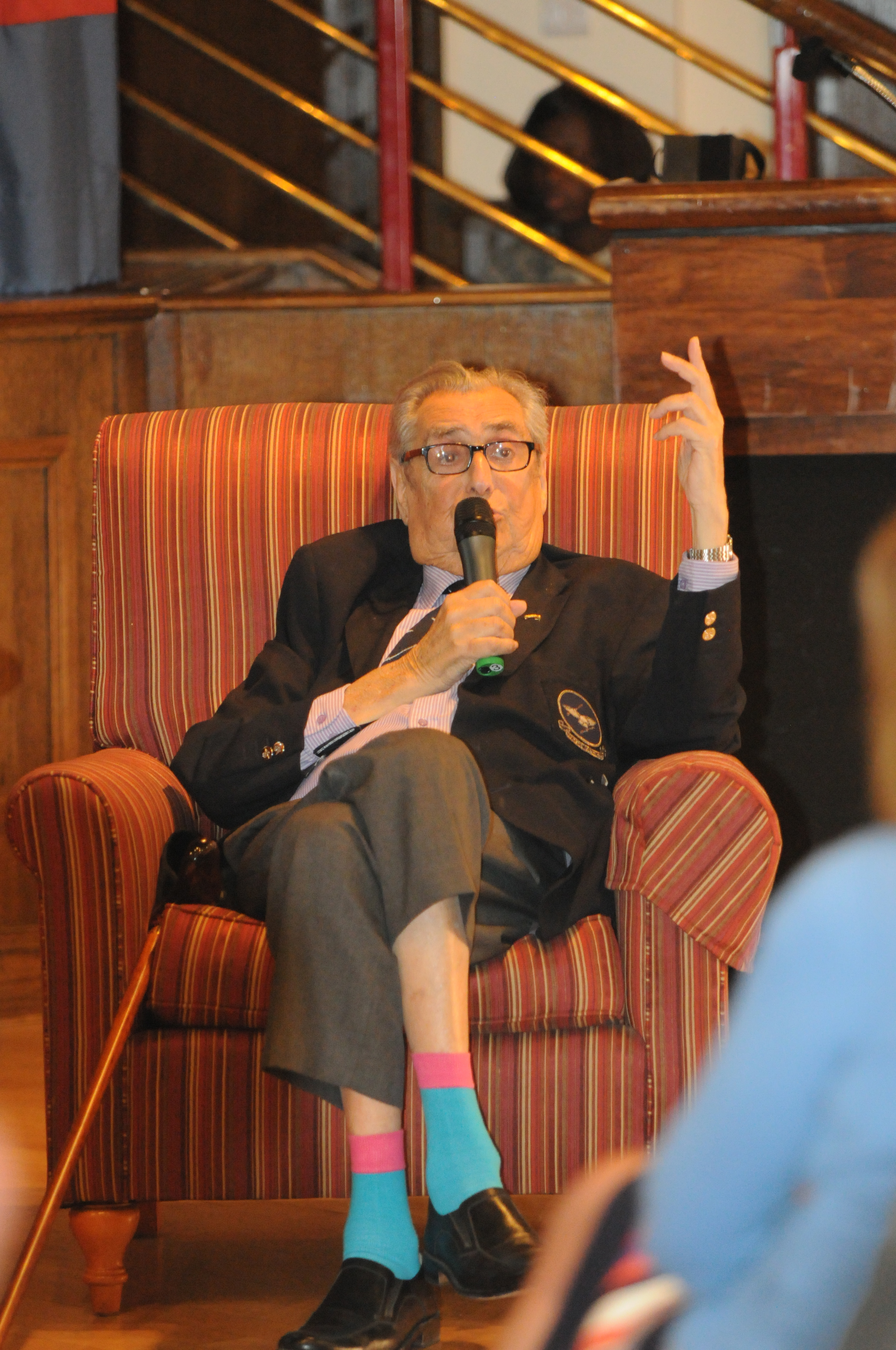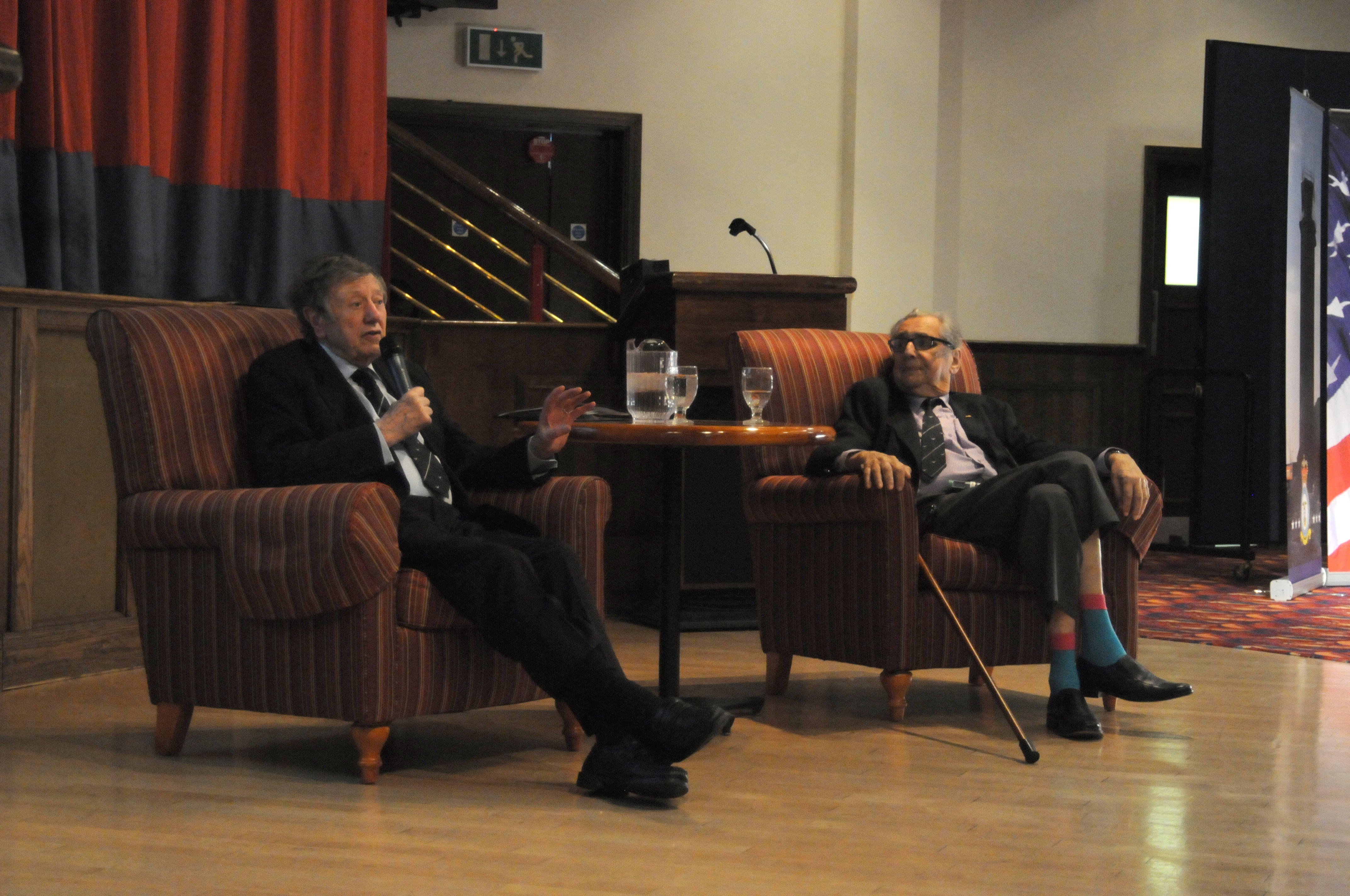 RAF Mildenhall, England - Retired RAF Air Cdre Charles Clarke, left, a former prisoner of war during World War II, speaks during a prisoner-of-war/missing-in-action interactive presentation at RAF Mildenhall, England, Sept. 19, 2012. Clarke and Andy Wiseman, both former prisoners of the German prison camp Stalag Luft III, visited Mildenhall to share their stories during POW/MIA remembrance week. (U.S. Air Force photo/Tech. Sgt. Neal X. Joiner)