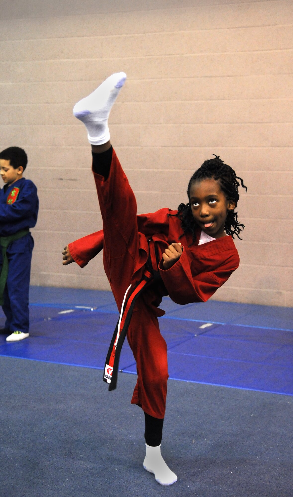 RAF MILDENHALL, England -- Tyler Thompson, right, uses a tripping technique to throw Gerrod Gibbs off balance and onto the mat during the RAF Mildenhall Youth Center’s Karate Camp March 15, 2012. Practicing martial arts styles taekwondo and hapkido, the monthly camp allows students to conduct larger exercises than their standard weekly classes afford. (U.S. Air Force photo/Staff Sgt. Thomas Trower)