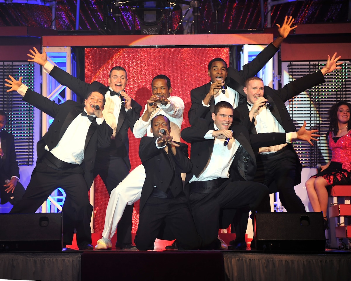 RAF MILDENHALL, England - Senior Airman Petrice Brown, Tops in Blue vocalist, performs during a show at the North Side Fitness Center here Oct. 8, 2011. The 2011 Tops in Blue tour, titled Rhythm Nation, focuses on the evolution of popular American music covering hits from various genres including swing, jazz, and rock and roll. (U.S. Air Force photo/Senior Airman Jerilyn Quintanilla)