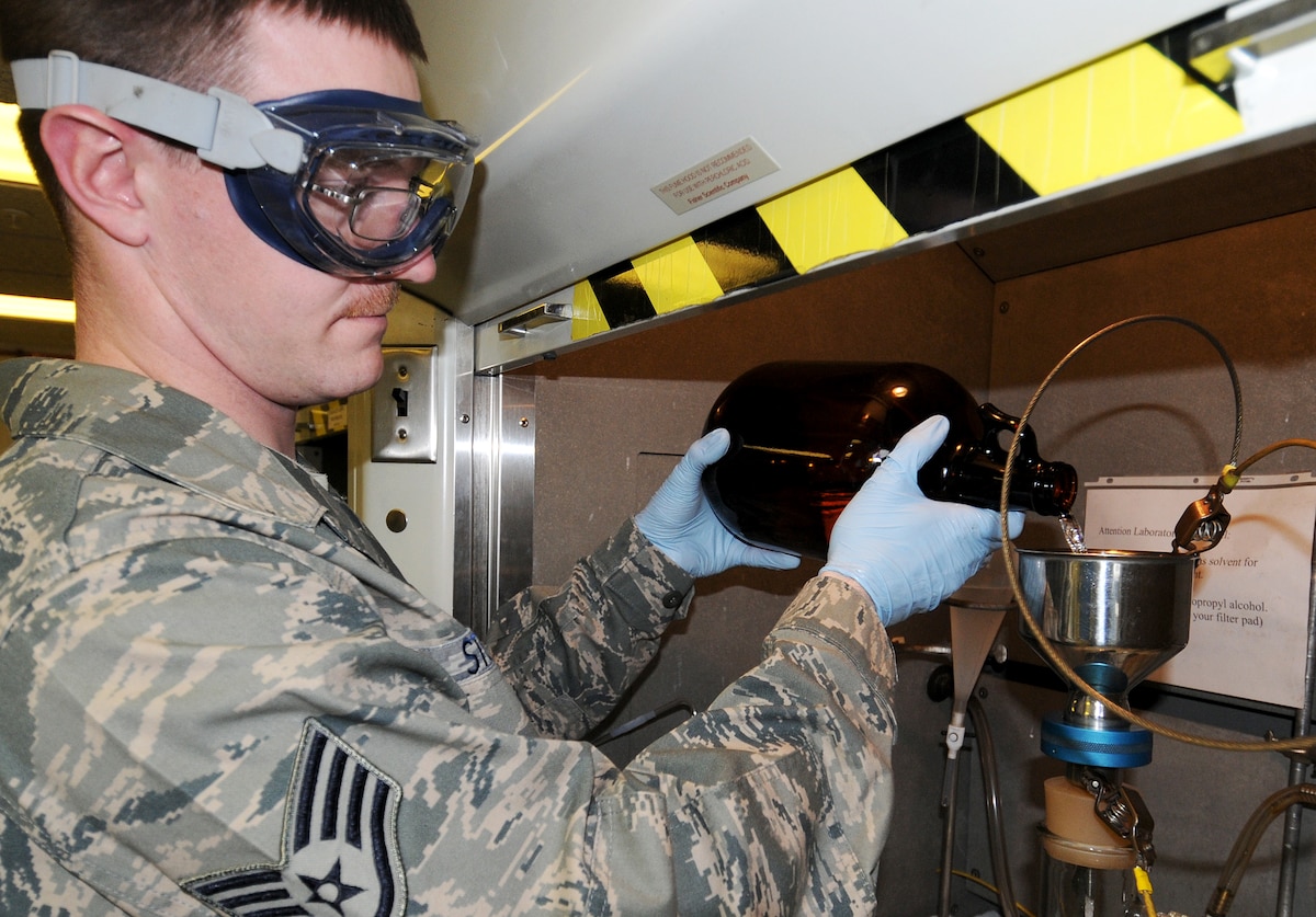 RAF MILDENHALL, England -- Staff Sgt. Jason Stump, 100th Logistics Readiness Squadron fuels laboratory technician, checks the temperature of a fuel sample before beginning a series of tests to ensure the fuel's quality meets standards here March 15, 2011. The 100th LRS Petroleum, Oil and Lubricant Flight issues an average of two million gallons of fuel a month to various U.S, civilian and coalition forces. (U.S. Air Force photo/Senior Airman Tabitha M. Lee)
