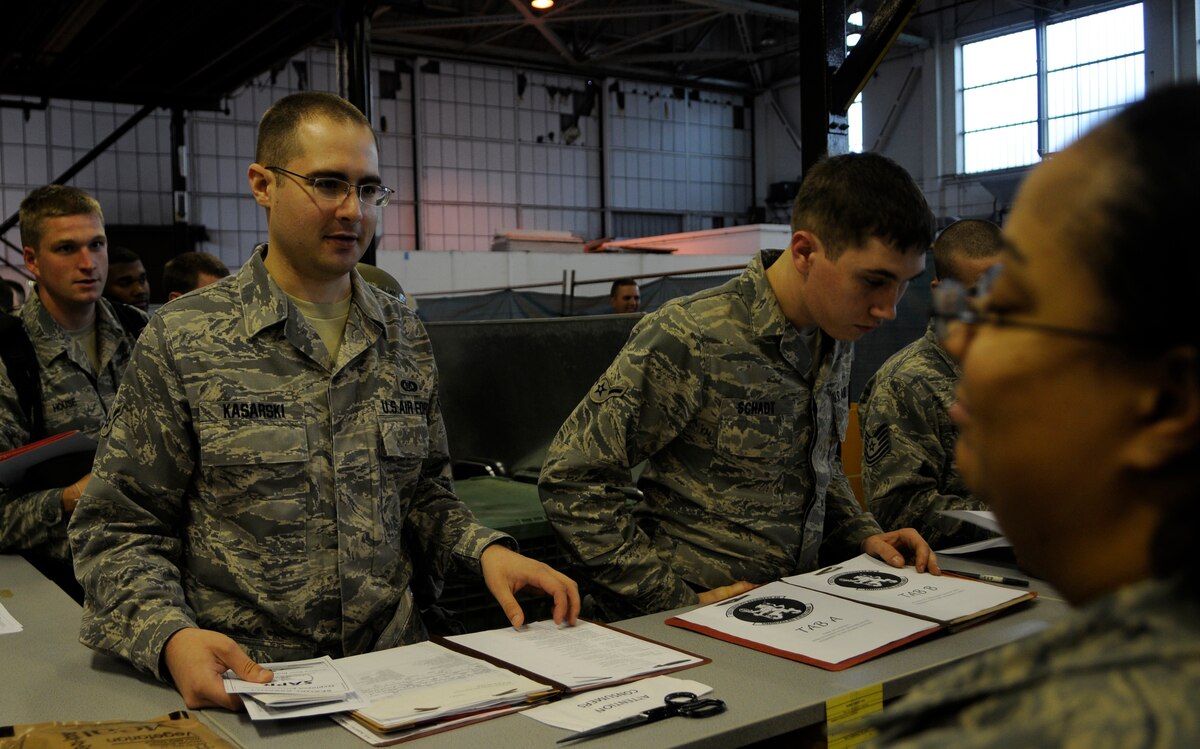 RAF MILDENHALL, England – Airman Ashley Turnage, 100th Logistics Readiness Squadron, goes through a processing line during the Phase I Operational Readiness Inspection Oct. 7. The line simulates what Airmen would go through to prepare for deployment. (U.S. Air Force photo/Staff Sgt. Christopher L. Ingersoll)