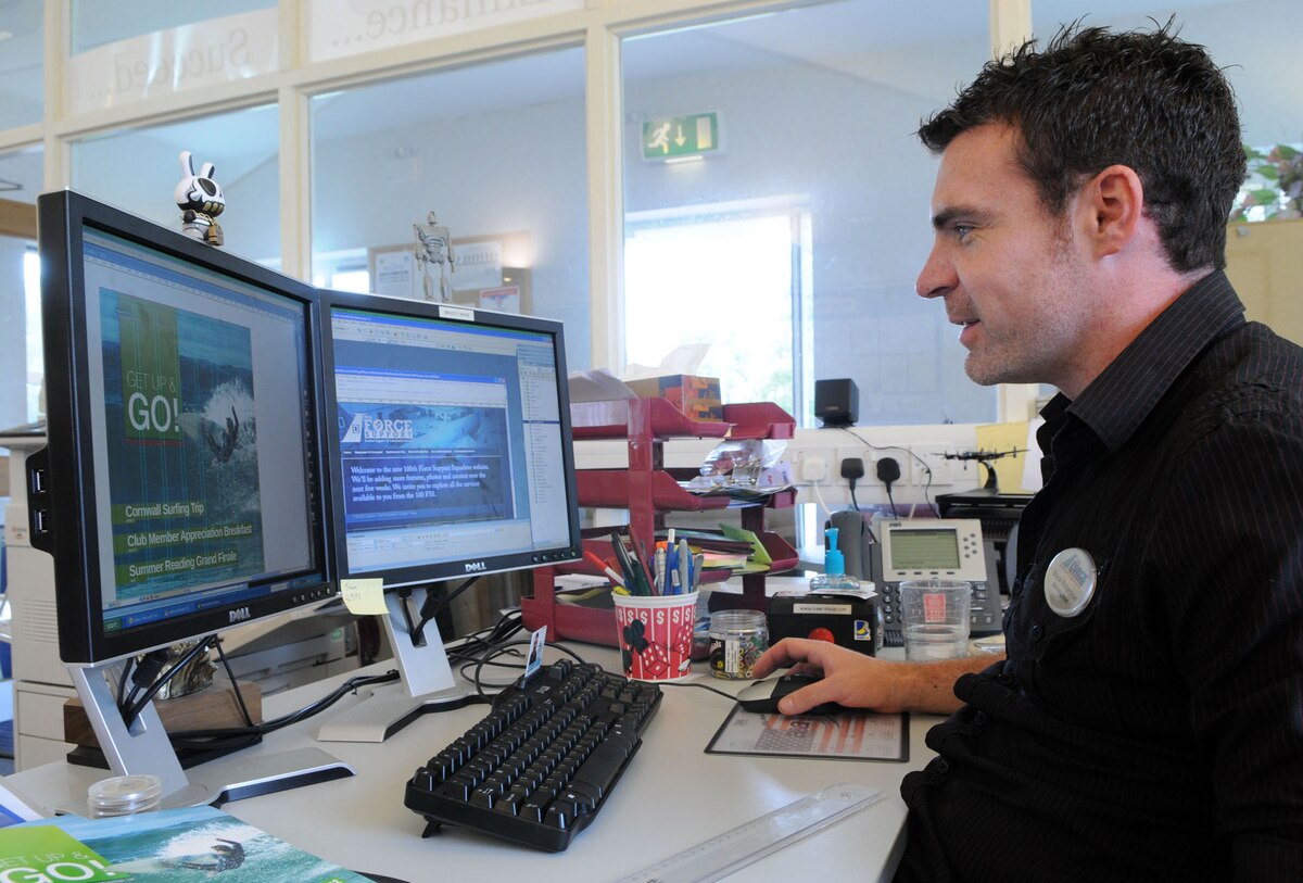 RAF MILDENHALL, England -- Bruce Richardson, 100th Force Support Squadron Marketing Department artist, works simultaneously on his squadron's magazine and web site. The Marketing Department produces a wide variety of products advertising events and promotions for Team Mildenhall. (U.S. Air Force photo by Staff Sgt. Austin M. May)