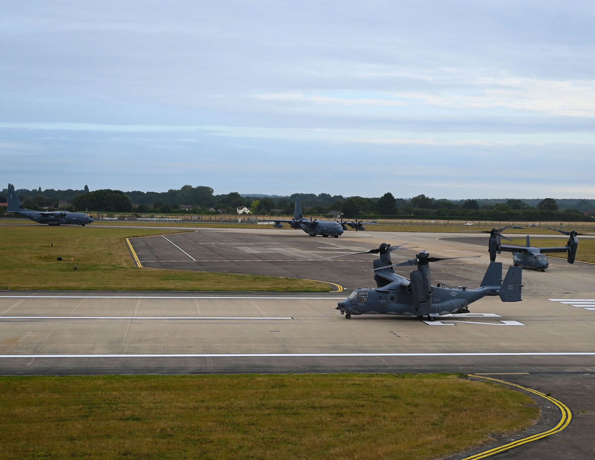 ROYAL AIR FORCE MILDENHALL, England -- Team Mildenhall aircraft participated in an “elephant walk” in conjunction with Exercise High Life at Royal Air Force Mildenhall Sept. 13, 2021. An elephant walk is a term used by the U.S. Air Force when multiple aircraft taxi together before takeoff.