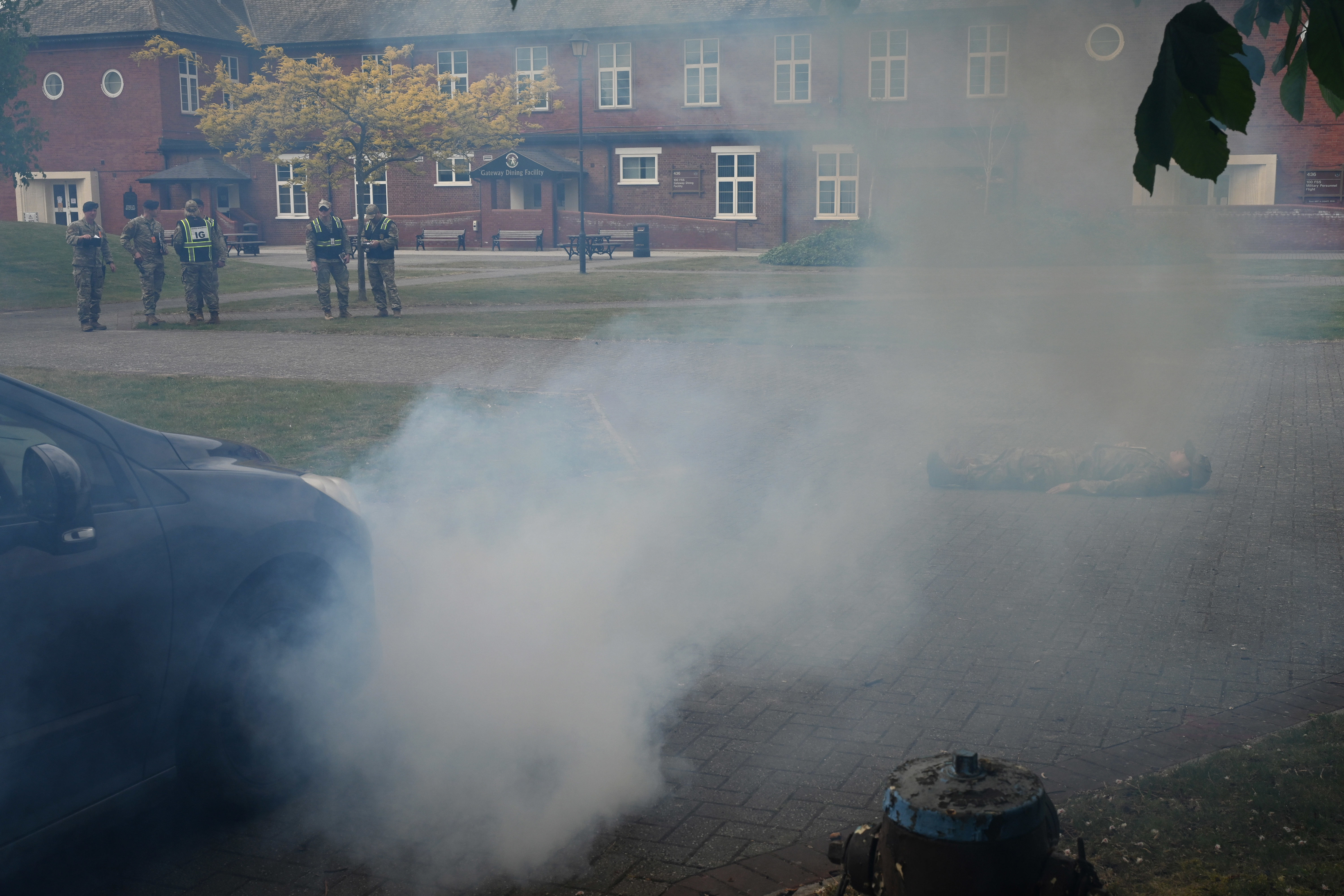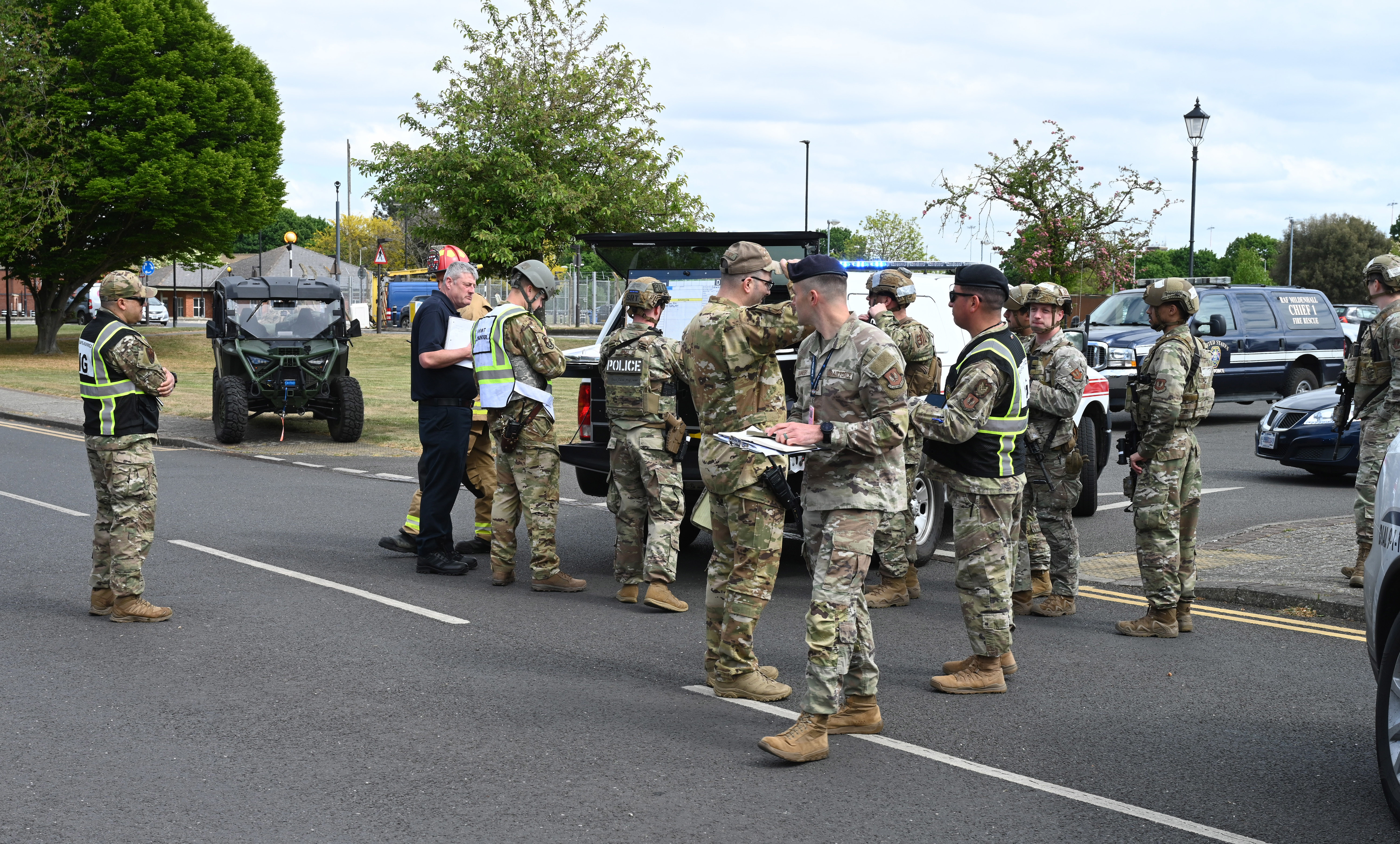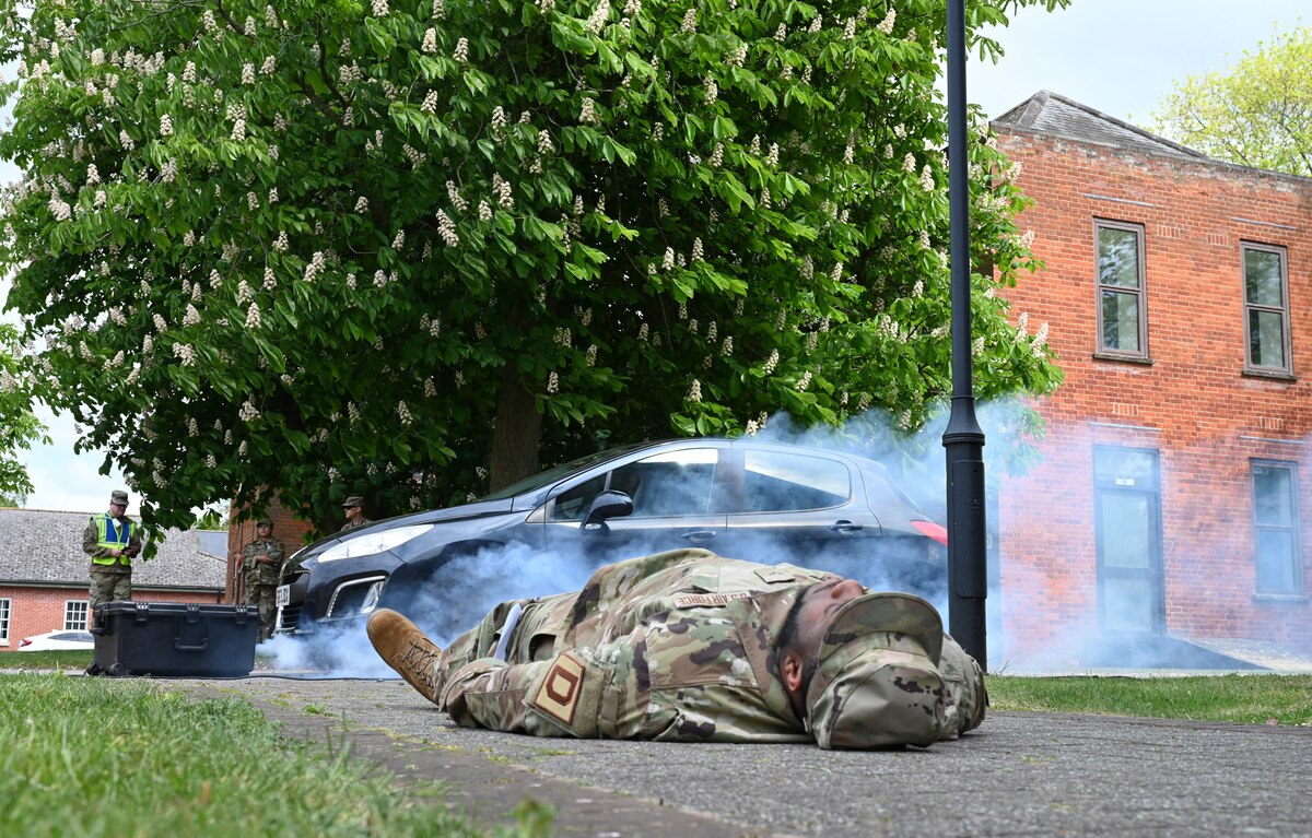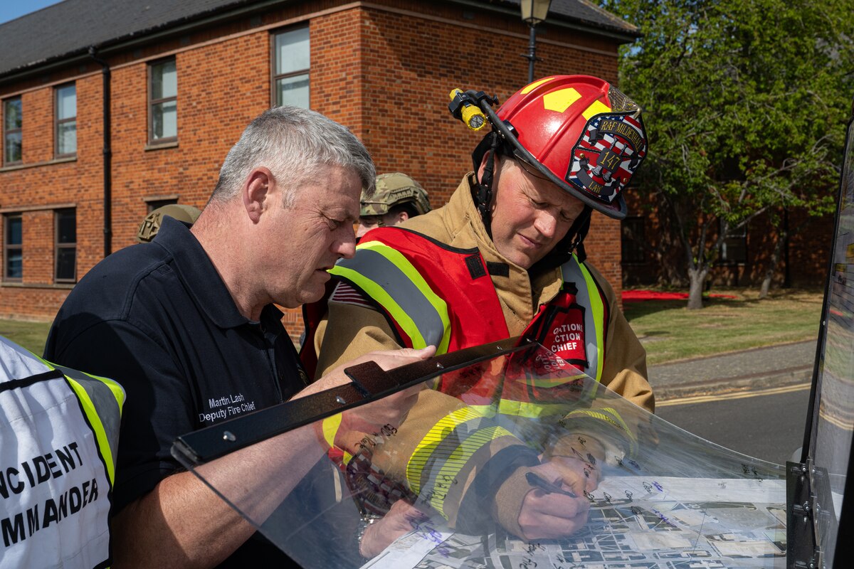 U.S. Airmen assigned to the U.S. Air Forces in Europe Inspector General oversee the emergency response during a simulated vehicle-borne improvised explosive device exercise scenario during the combat readiness inspection Skyway Chariot at RAF Mildenhall, England, May 8, 2025. The inspection was intended to validate the wing's ability to generate, employ, sustain, and project combat power in a highly contested environment. (U.S. Air Force photo by Senior Airman Christopher Campbell)