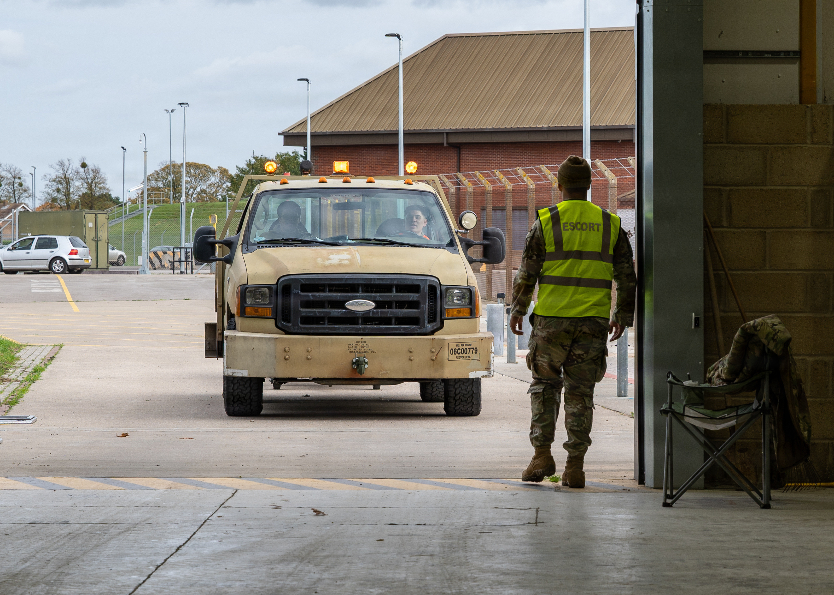 U.S. Airmen conduct a cargo deployment function for exercise King Bee at RAF Mildenhall, England, Oct. 28, 2025. The team conducted physical inspections on all various cargo items, ensuring that the materials were stored correctly and the weight of the cargo was accurately recorded.