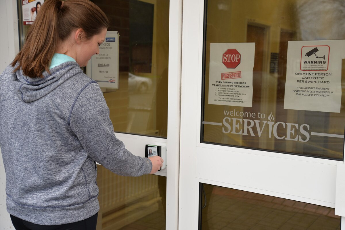 U.S. Air Force Airman Taylor Barnard, left, 100th Force Support Squadron fitness journeyman, talks U.S. Air Force Senior Airman Hope Kollauf, 100th Security Forces Squadron combined controller, through the registration process for the Northside Fitness Center’s fitness access program Jan. 7, 2016, on RAF Mildenhall, England. The program is being put into place Air Force-wide as facilities become unmanned. It gives members 24/7 access to the gym, enabling them to work out when they choose, even after hours, or on U.S. holidays and goal or family days. (U.S. Air Force photo by Karen Abeyasekere/Released)