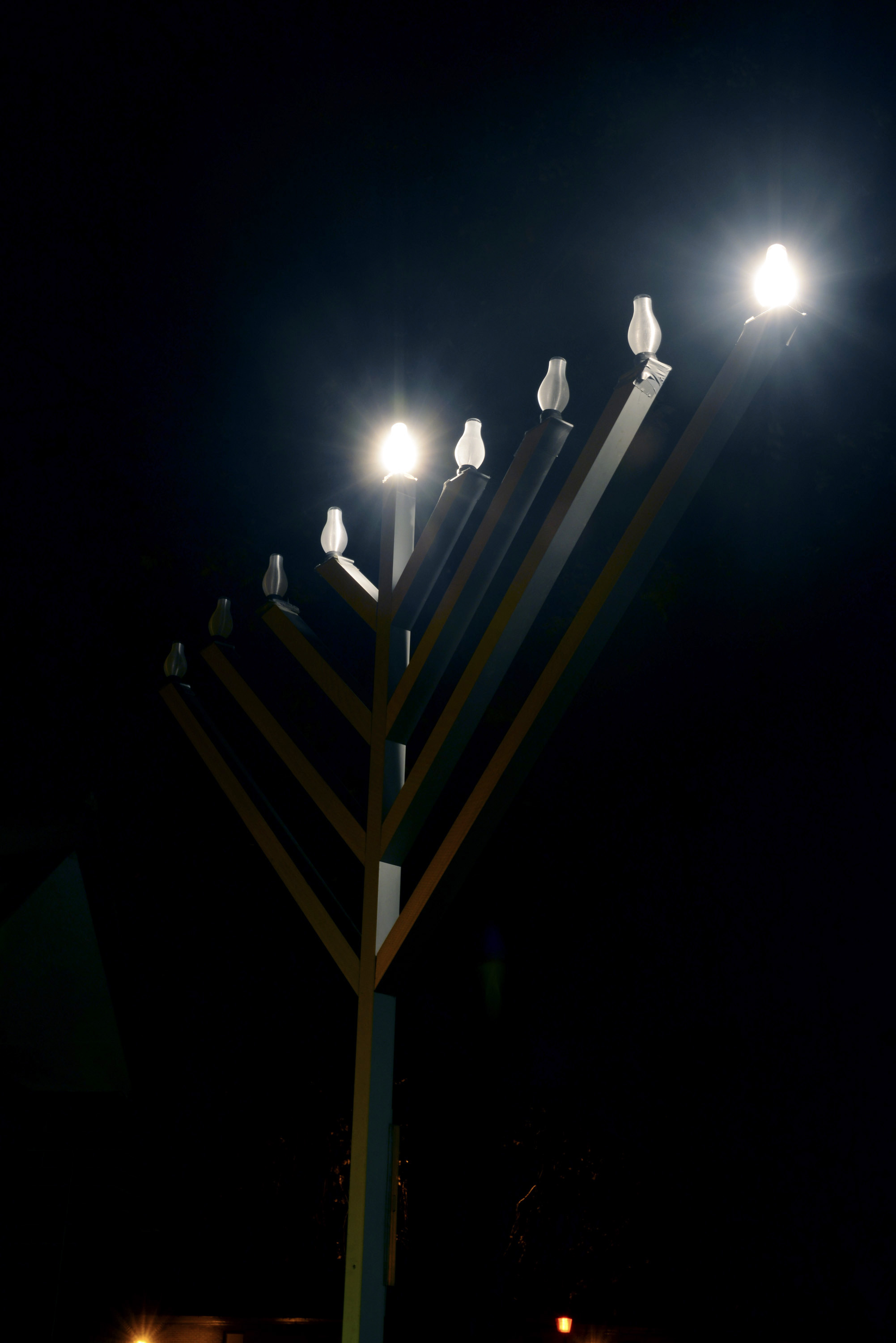A menorah glows after a Hanukkah menorah lighting ceremony Dec. 6, 2015, in front of the base chapel on RAF Mildenhall, England. The Hanukkah menorah lighting ceremony is one of the many holiday observances hosted by RAF Mildenhall. (U.S. Air Force photo by Staff Sgt. Micaiah Anthony/Released)