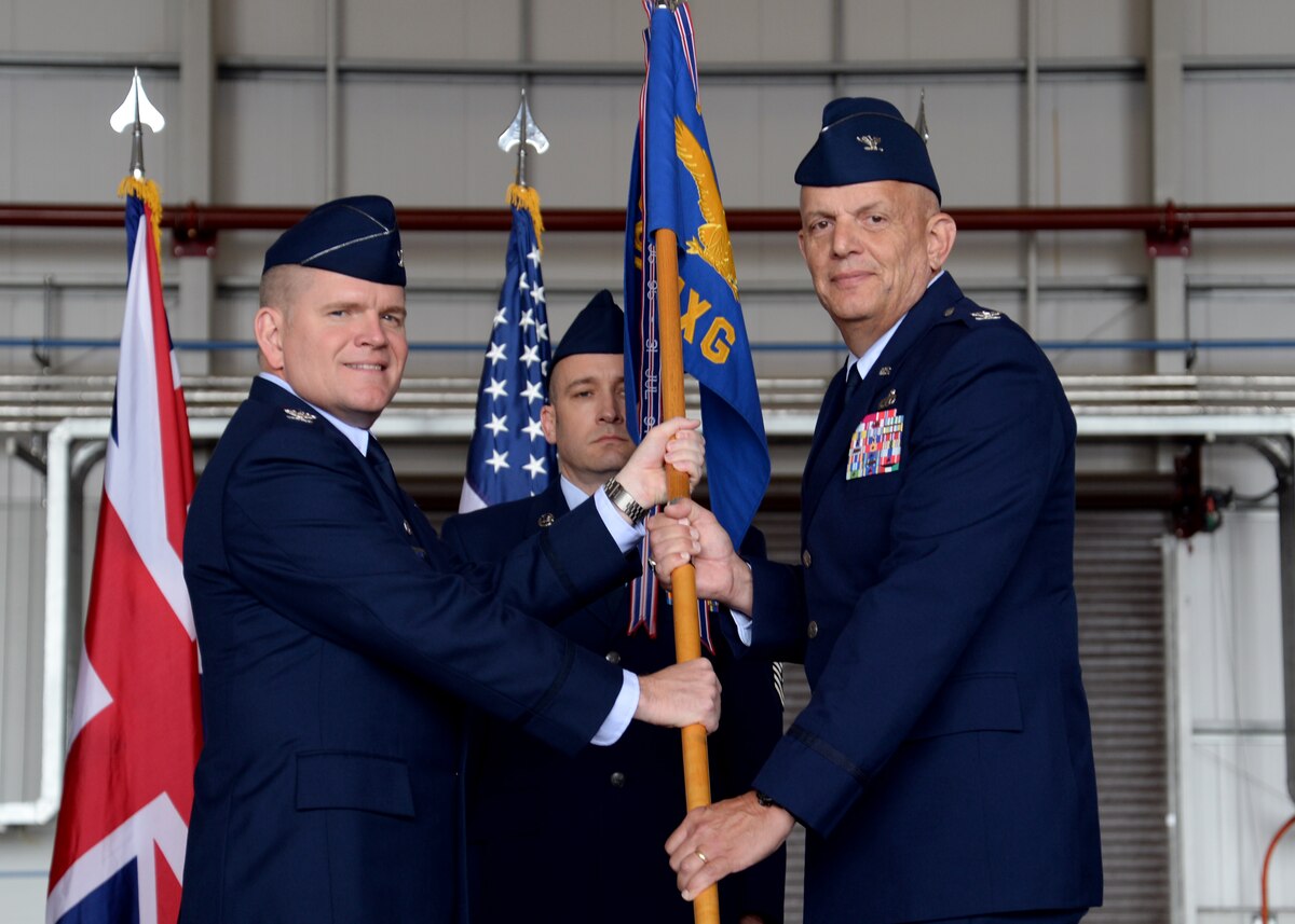 U.S. Air Force Col. Thomas D. Torkelson, left, 100th Air Refueling Wing commander, gives command of the 100th Maintenance Group to U.S. Air Force Col. Kelly Scott, incoming 100th MXG commander, during the 100th MXG change of command ceremony June 17, 2015, on RAF Mildenhall, England. The passing of the unit guidon during a change of command ceremony is a symbolic representation of passing authority to the incoming commander for all to see. (U.S. Air Force photo by Senior Airman Kyla Gifford/Released)