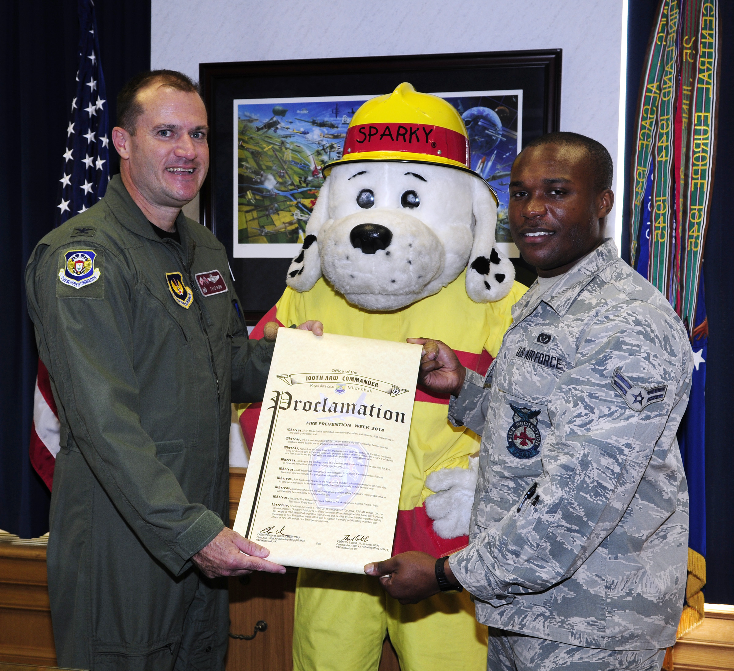 U.S. Air Force Col. Kenneth T. Bibb Jr., left, 100th Air Refueling Wing commander; Sparky the Fire Dog and U.S. Air Force Airman 1st Class Kaylon Centers, 100th Civil Engineer Squadron Fire Department fire protection apprentice from Longview, Texas, show off the signed proclamation marking the upcoming Fire Prevention Week Oct. 3, 2014, at the 100th ARW headquarters building on RAF Mildenhall, England. Fire Prevention Week is held annually and provides continued education for service members and their families on responding to fires. (U.S. Air Force photo/Karen Abeyasekere/Released)