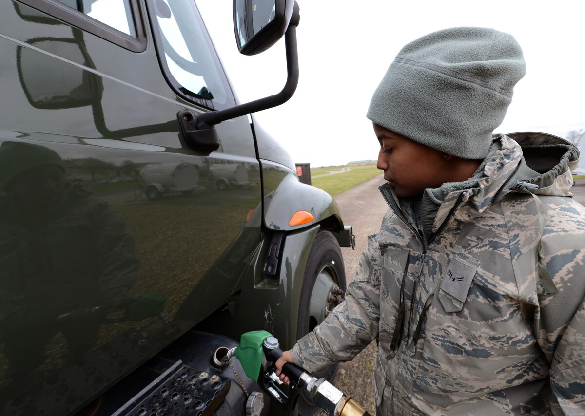 U.S. Air Force Airman 1st Class Taylor Pryor, 100th Logistics Readiness Squadron mobile fuels distribution operator from Orlando, Fla., fuels a C-300 Ground Fuel Truck Feb. 12, 2014, on RAF Mildenhall, England. Pryor earned the Square D Spotlight for exhibiting the Air Force Core Value of Service Before Self. (U.S. Air Force photo by Airman 1st Class Kyla Gifford/Released)