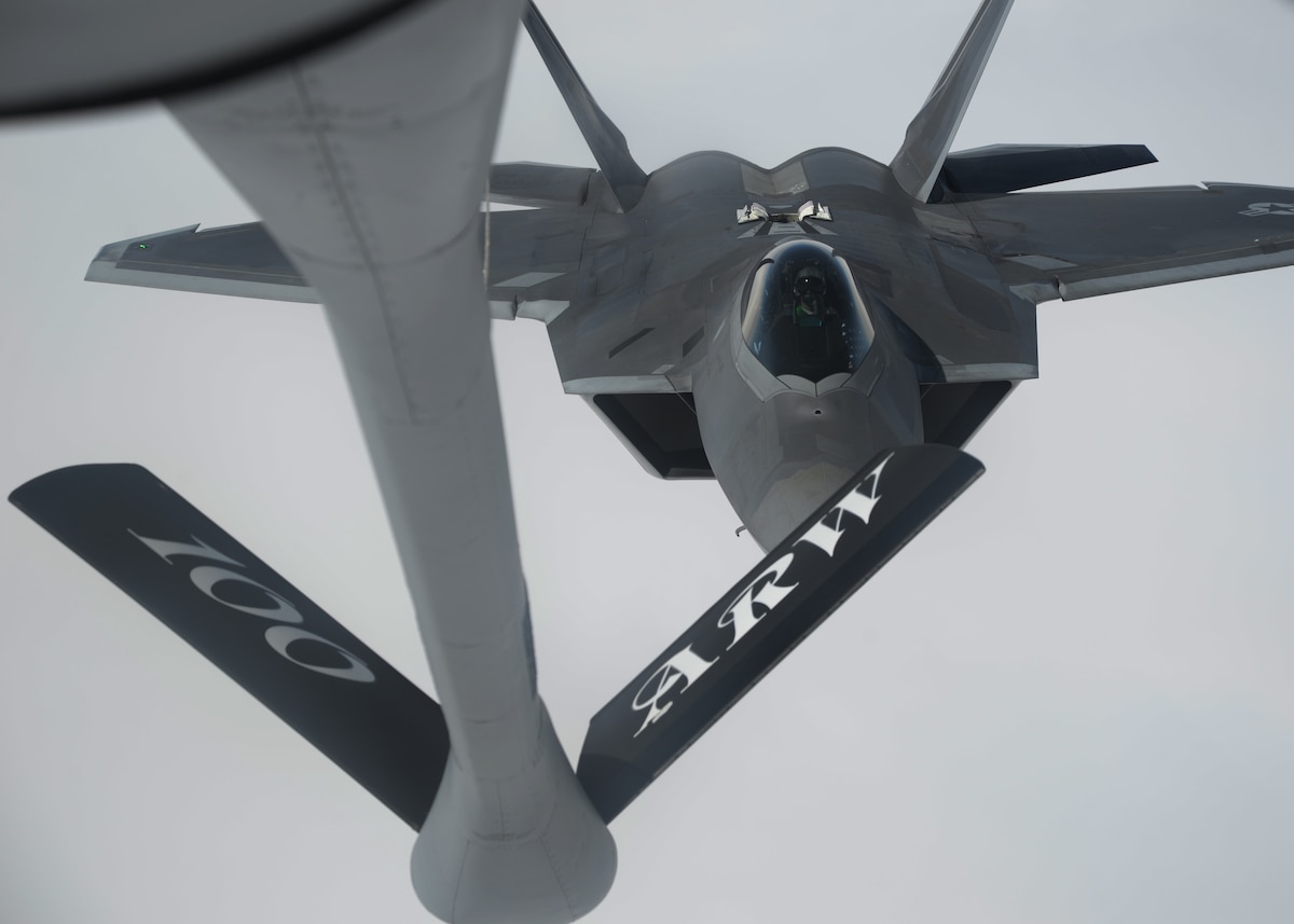 A U.S. Air Force F-22 Raptor assigned to the 95th Fighter Squadron at Tyndall Air Force Base, Fla., pulls into position to receive fuel from a 100th Air Refueling Wing KC-135 Stratotanker assigned to RAF Mildenhall, England, April 27, 2016, in route to Šiauliai Air Base, Lithuania. The aircraft will conduct air training with other Europe-based aircraft, demonstrating the U.S. commitment to NATO allies and the security of Europe. (U.S. Air Force photo by Staff Sgt. Nathan Tucker/Released)