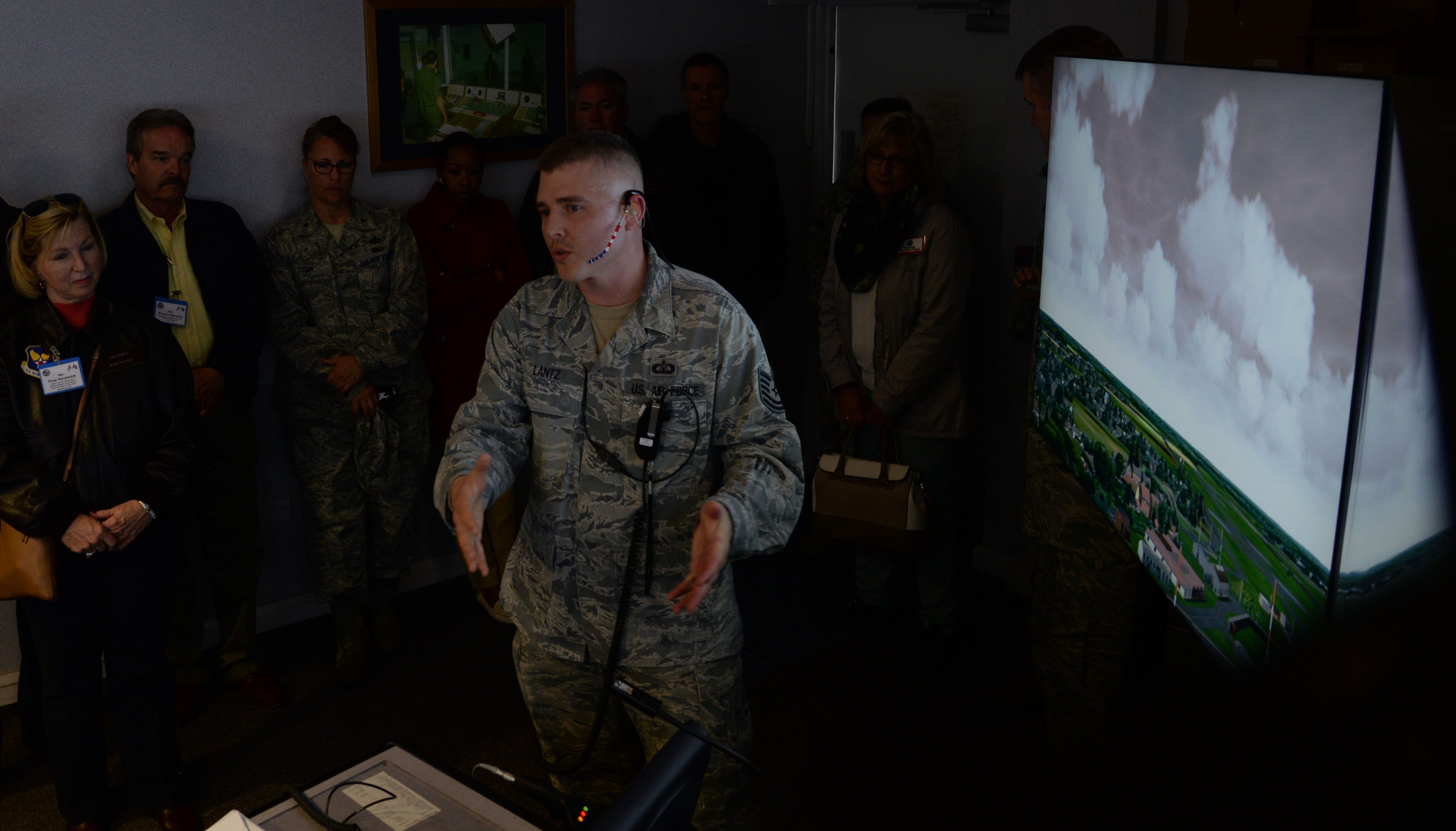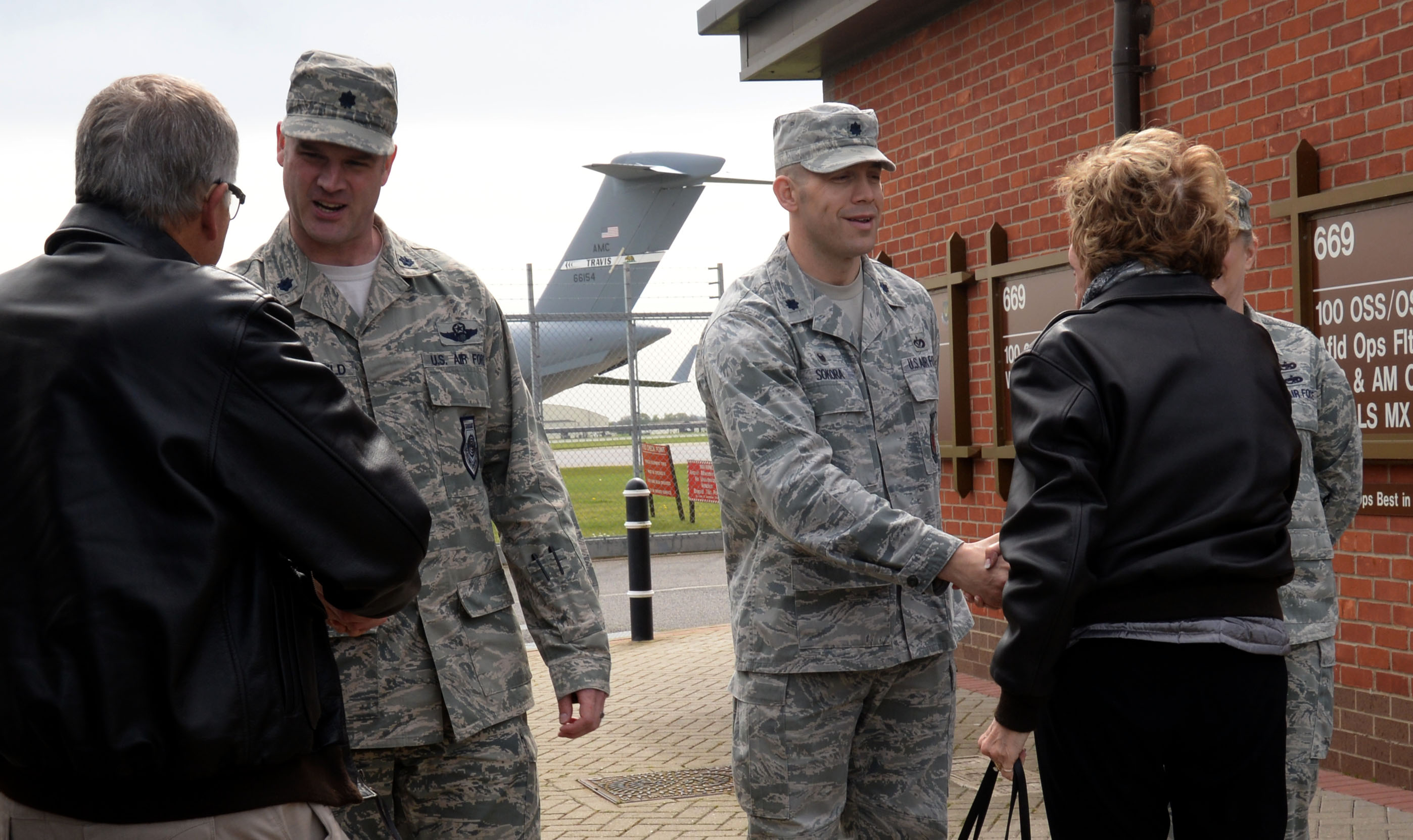 U.S. Air Force Lt. Col. Jay Butterfield, 100th Operations Support Squadron commander, left, and U.S. Air Force Lt. Col. Brandon Sokora, 100th Civil Engineering Squadron commander, greet civic leaders April 21, 2016, as they arrive at the 100th OSS Air Traffic Control tower on RAF Mildenhall, England. The attendees of the AF Civic Leader Program visited the ATC tower and the 100th CES fire department to learn about their mission and meet Airmen. (U.S. Air Force photo by Senior Airman Justine Rho/Released)