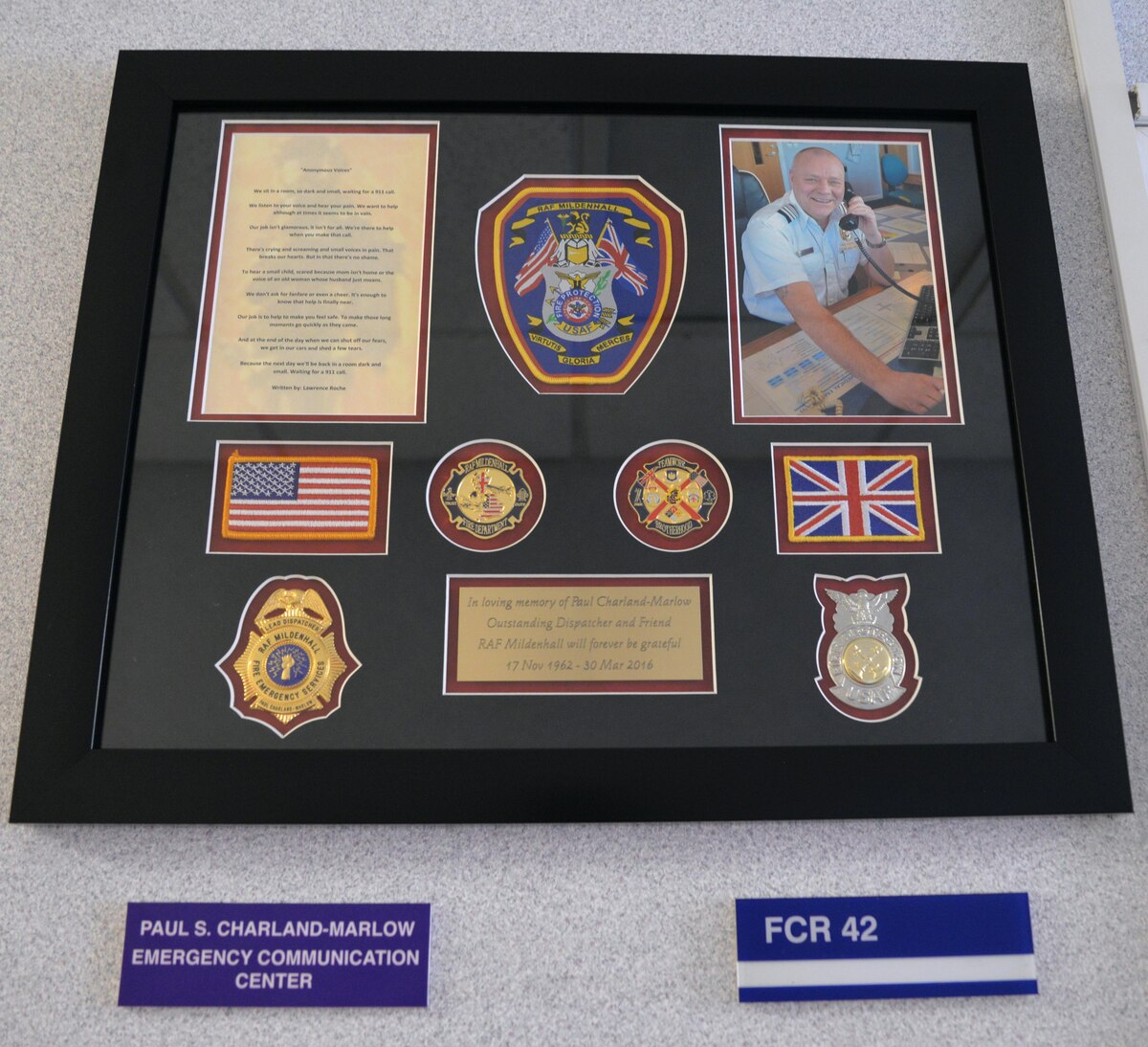 U.S. Air Force Col. Thomas D. Torkelson, second left, 100th Air Refueling Wing commander, and Michelle Charland-Marlow, wife of Paul Charland-Marlow, former 100th Civil Engineer Squadron Fire Department lead dispatcher, unveil a tribute to her late husband outside the emergency communication center Sept. 9, 2016, on RAF Mildenhall, England. Paul Charland-Marlow passed away March 30, 2016. The firefighters dedicated their alarm room to him so his memory would live on. (U.S. Air Force photo by Karen Abeyasekere)