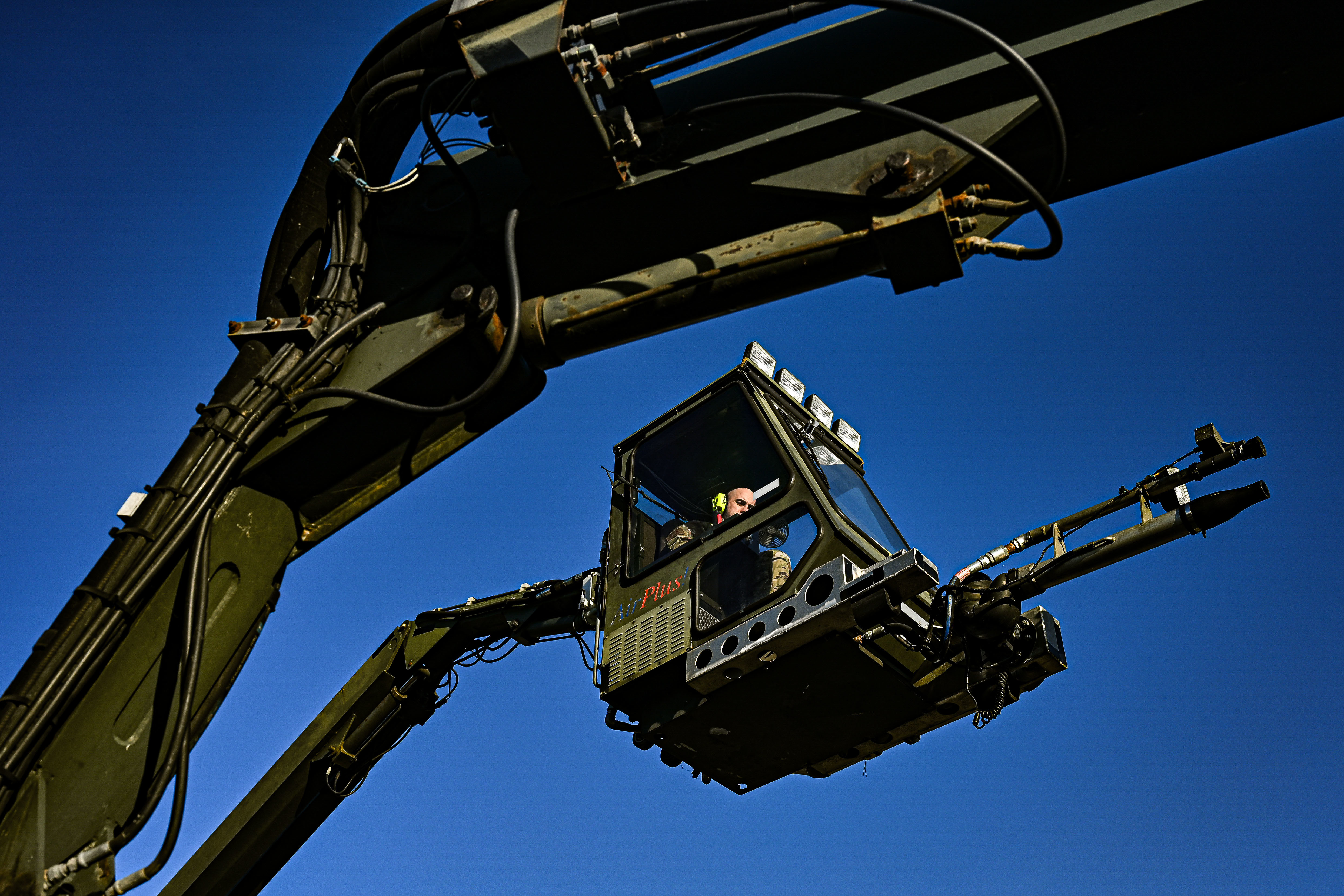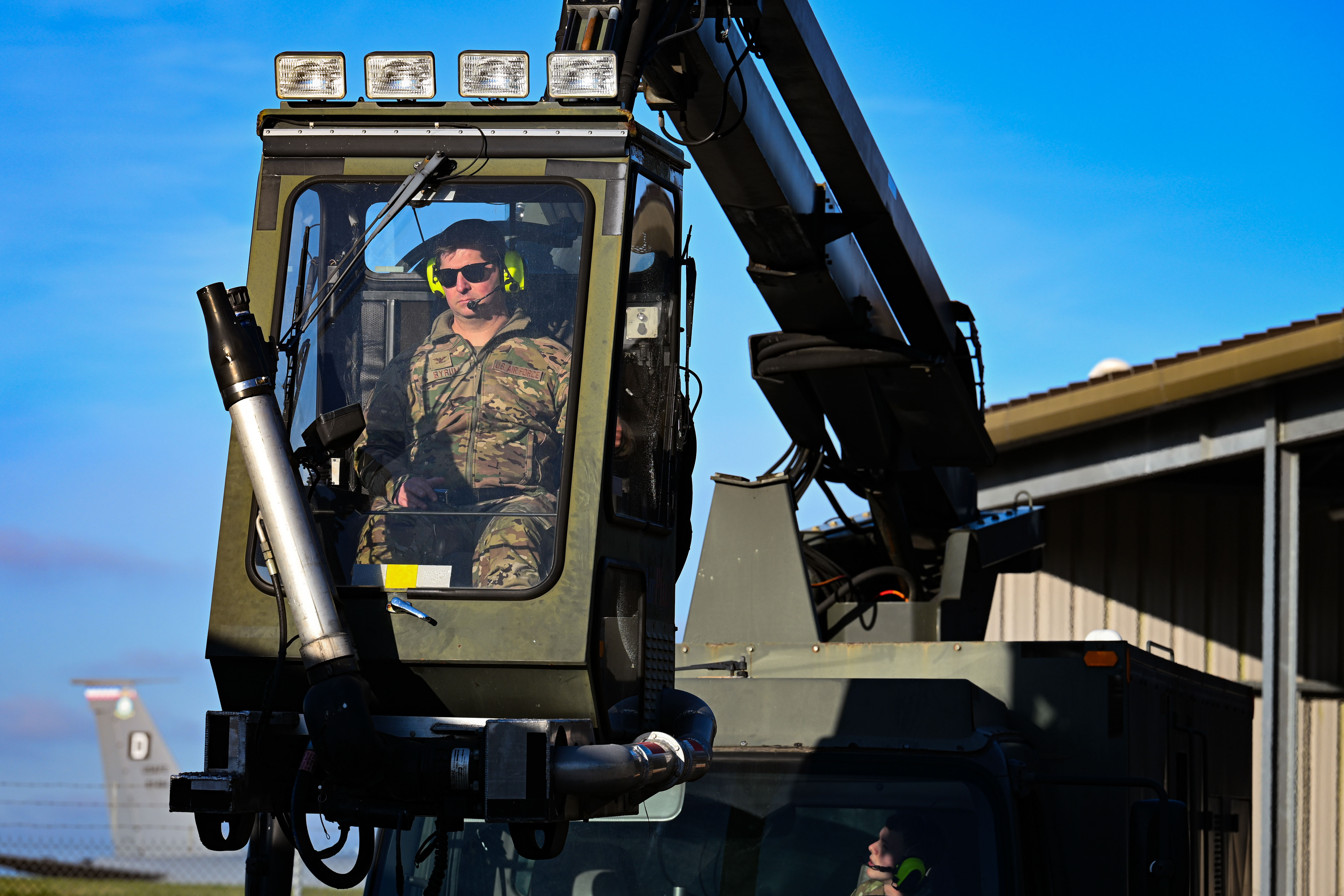 U.S. Air Force Chief Master Sgt. Tiffany Griego, right, 100th Air Refueling Wing command chief, and Airman Taylor Cox, 100th Force Support Squadron Military Personnel Flight customer support technician, print a common access card at Royal Air Force Mildenhall, England, Jan. 10, 2025. During a Day in the Life immersion, the MPF section showed the 100th ARW command team some of the common tasks they accomplish for service members and their families, including fixing CAC-related issues, which required to be renewed regularly similar to many U.S. drivers licenses. (U.S. Air Force photo by Senior Airman Nash Truitt.)