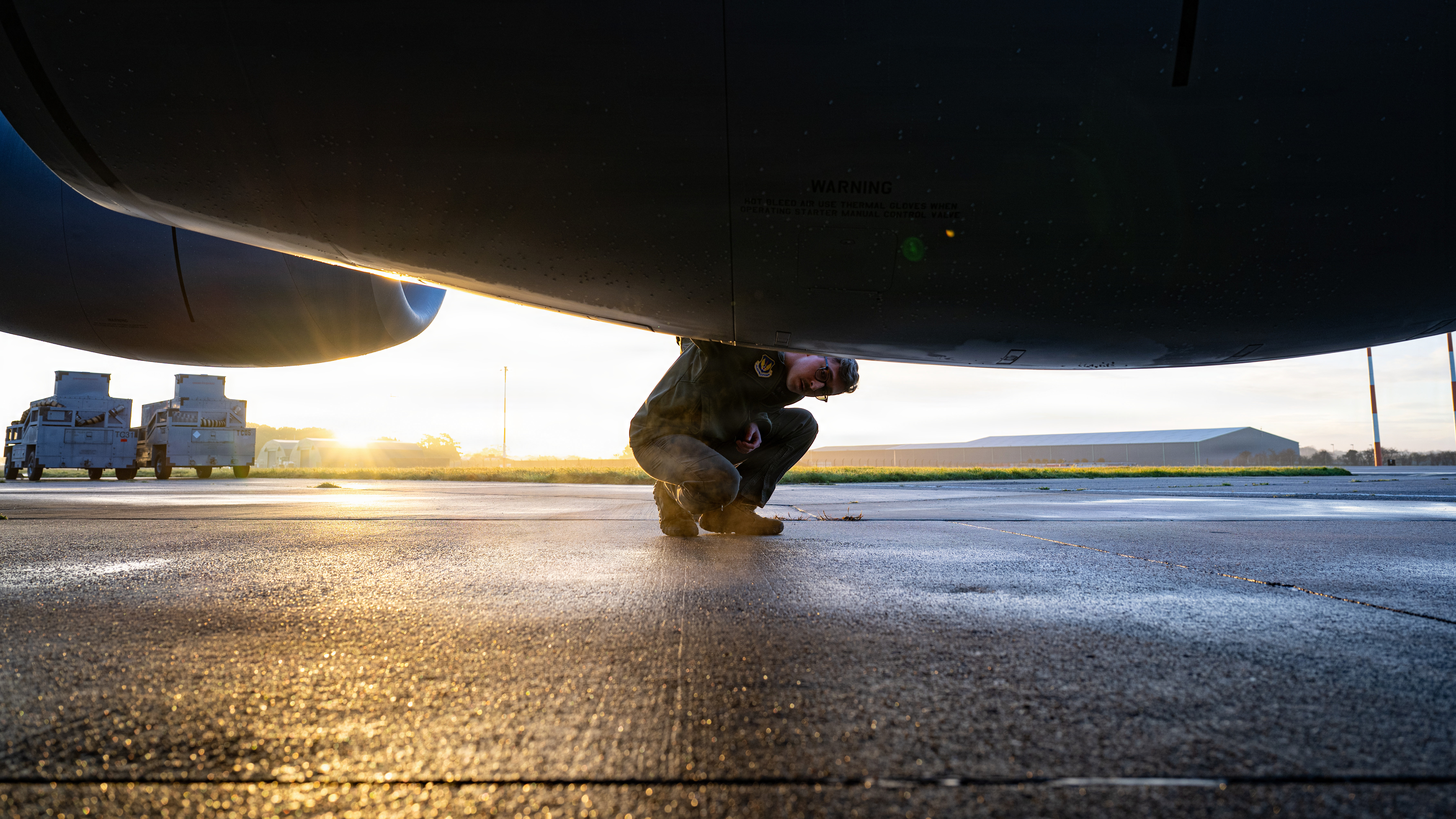 U.S. Air Force Capt. Daniel Coolbaugh, left, 351st Air Refueling Squadron pilot, Senior Airman Connor Habusta, center, 100th Aircraft Maintenance Squadron crew chief, and Capt. Jonathan Hajduk, 48th Operational Medical Readiness Squadron flight doctor, conduct preflight checks before a refueling mission at RAF Mildenhall, England, Dec. 3, 2025. The 100th ARW provides the critical aerial refueling capability that expands the lethality of U.S., Allied and partner-nation aircraft. (U.S. Air Force photo by Airman 1st Class Aidan Martínez Rosiere)