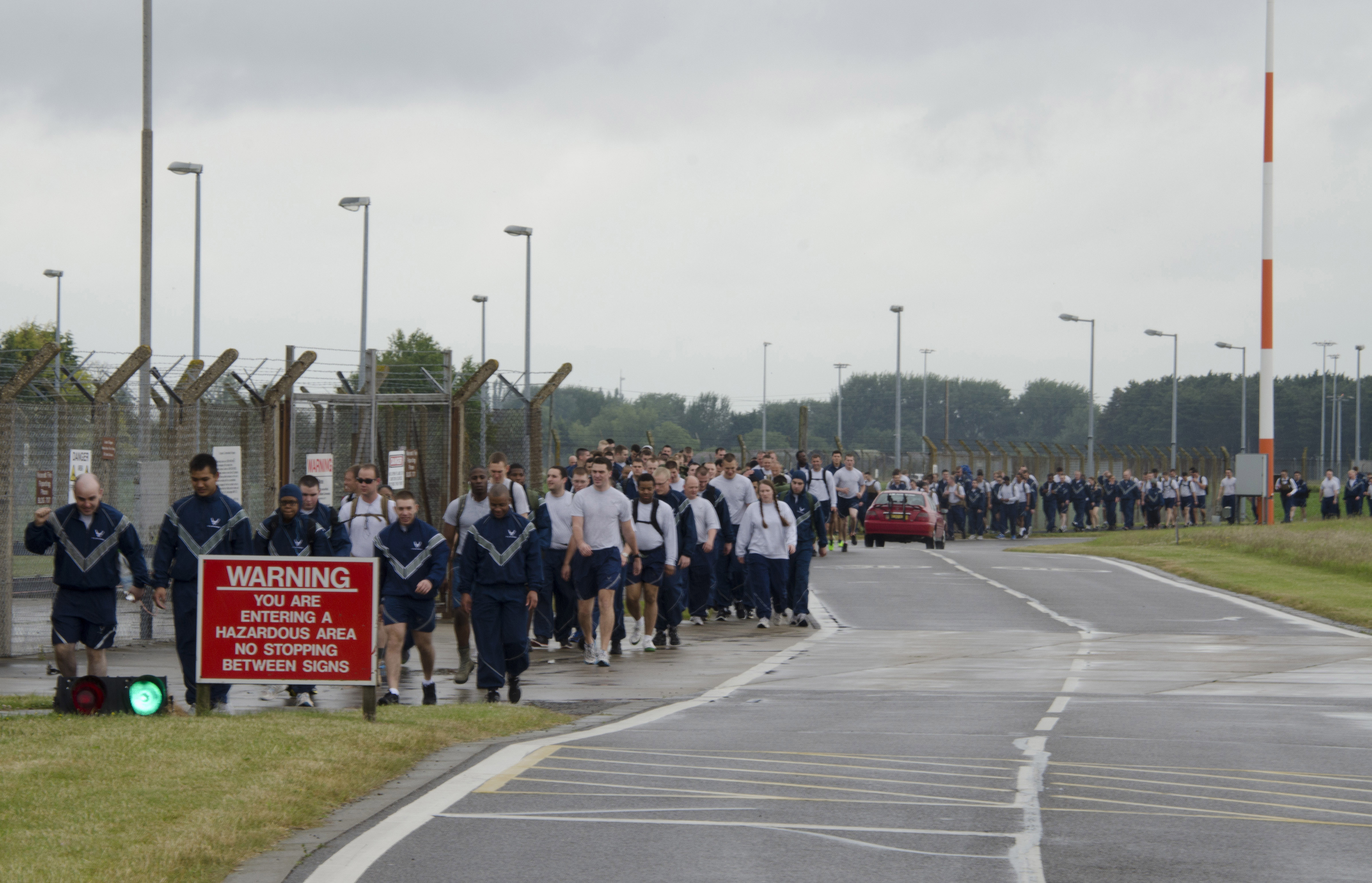 Members of the 352nd Special Operations Group march with ruck sacks in support of sexual assault prevention June 28, 2013, on RAF Mildenhall, England. The ruck march was part of the 352nd SOG Sexual Assault Prevention and Response down day. (U.S. Air Force photo by Staff Sgt. Stephen Linch/Released)