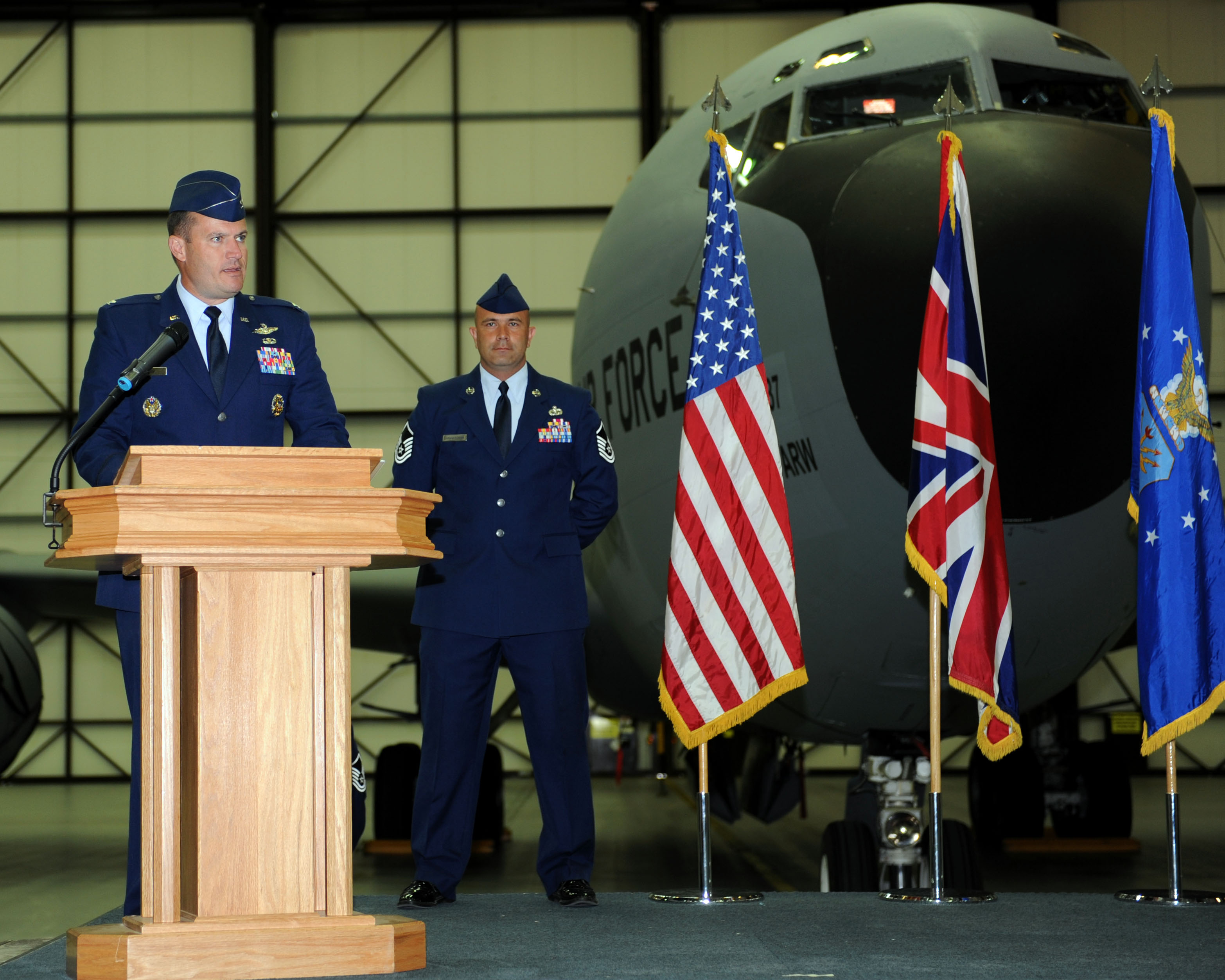 Col. Kenneth T. Bibb Jr., 100th Air Refueling Wing commander, addresses Airmen attending the 100th Maintenance Group change of command ceremony July 2, 2013, on RAF Mildenhall, England. As the 100th ARW commander, Bibb presided over the ceremony and served as the official who transferred command of the 100th MXG from Col. Joseph Rushlau to Col. Earl Scott. (U.S. Air Force photo by Airman 1st Class Preston Webb/Released)