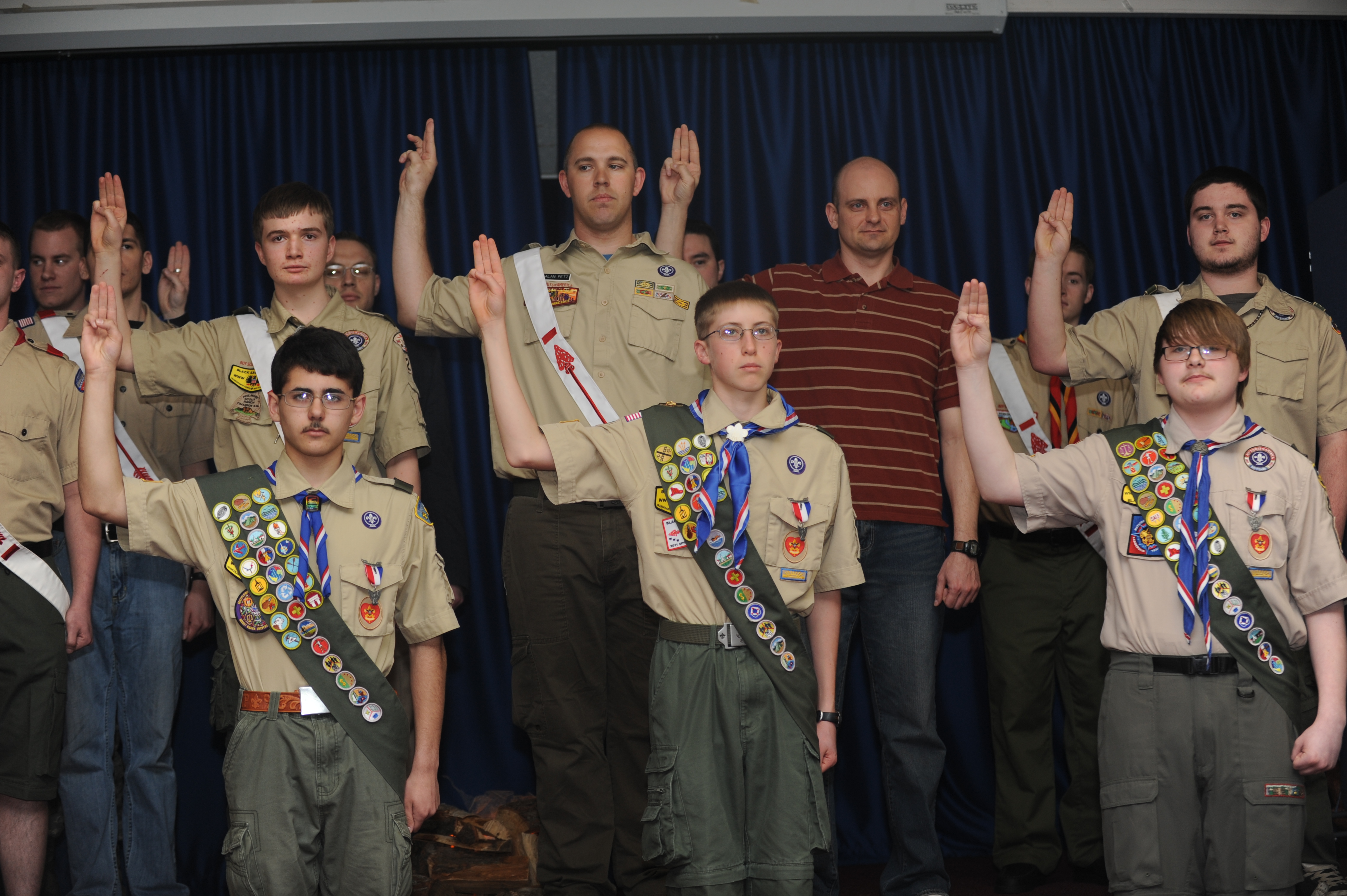 From left, Conor Roberts, son of Tech Sgt. Charles Roberts, 48th Aircraft Maintenance Squadron activity security manager; Kyle Thompson, son of Lt. Col. Shawn Thompson, 48th Mission Support Group deputy commander; and Daniel Ritter, son of Capt. John Ritter, 48th Fighter Wing chaplain, recite the Scout oath along with a group of Eagle Scouts during an Eagle Scout court of honor April 19, 2013, at the chapel on RAF Lakenheath, England. Conor, Kyle and Daniel acknowledged people who mentored them through their journey to becoming an Eagle Scout during the ceremony. (U.S. Air Force photo by Airman 1st Class Preston Webb/Released)