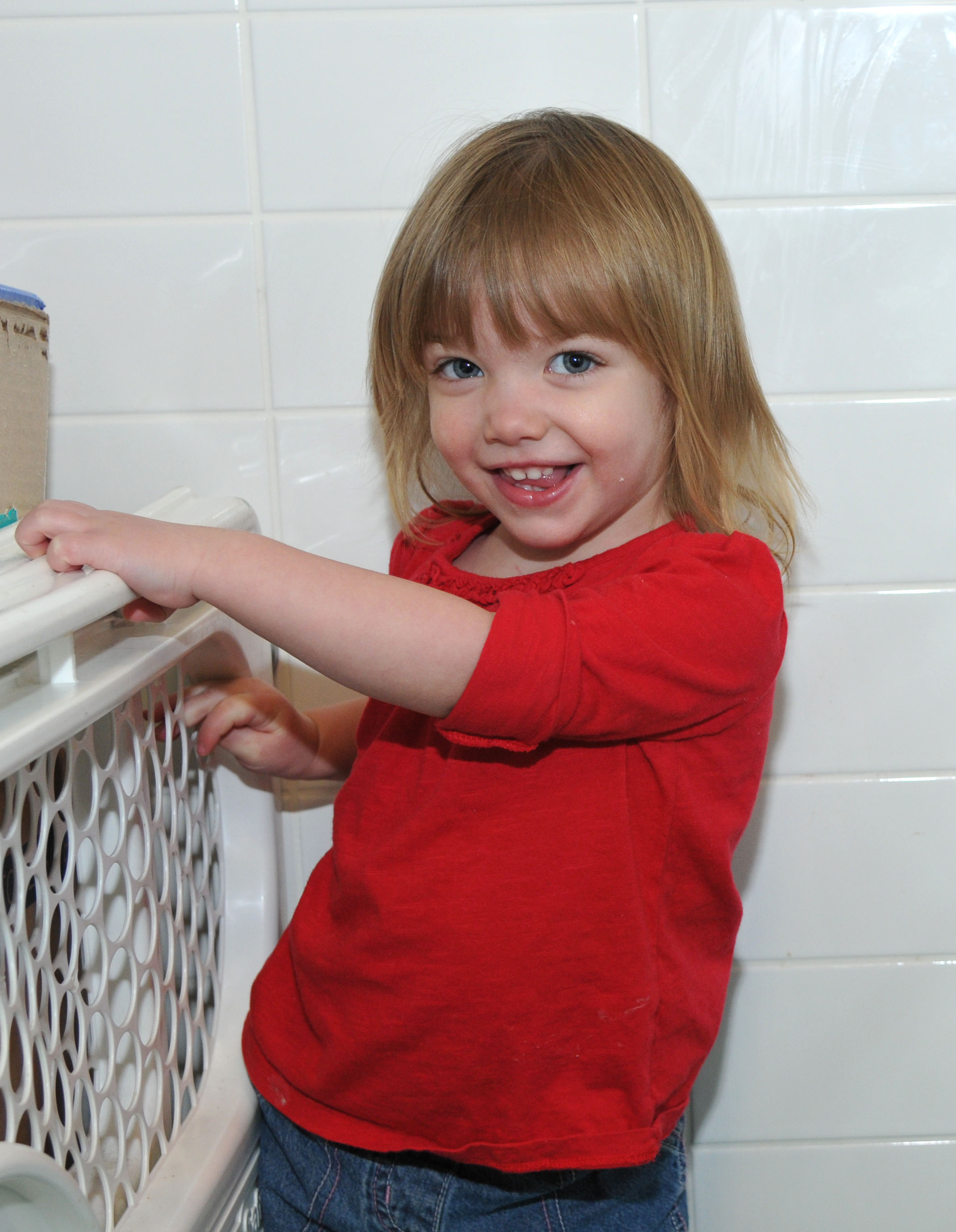 Zoe Davis, 1, daughter of Staff Sgt. Steven Davis, 352nd Special Operations Support Squadron group contingency operations NCO in charge, wears red and blue April 11, 2013, as part of spirit week at the Child Development Center on RAF Mildenhall, England. The spirit week is in support of the Month of the Military Child. (U.S. Air Force photo by Airman 1st Class Kelsey Waters/Released)