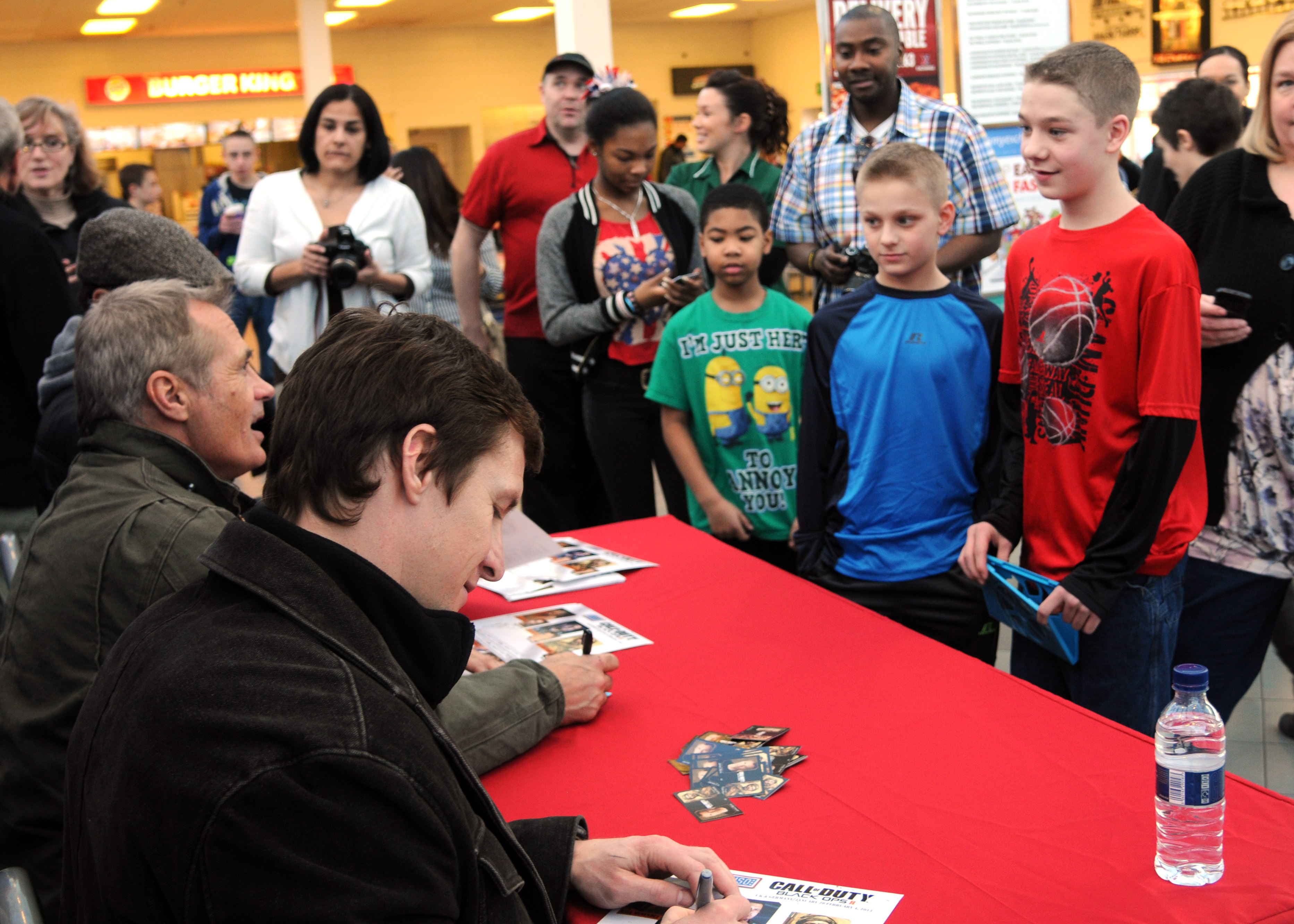Voice actors from the videogame Call of Duty: Black Ops II sign autographs for fans inside of the food court Jan. 30, 2013, at RAF Mildenhall, England. The actors visited the base as part of their UK and Germany United Services Organizations tour. (U.S. Air Force photo by Airman 1st Class Kelsey Waters/Released)