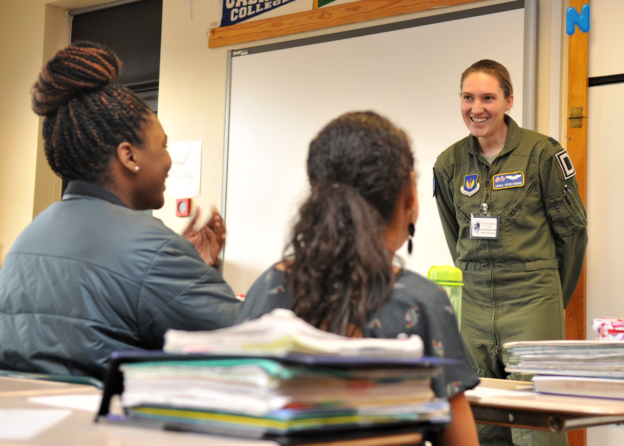 Capt. Erika Shortridge, 351st Air Refueling Squadron KC-135 Stratotanker pilot, RAF Mildenhall, speaks to students Jan. 11, 2013, at Lakenheath High School, RAF Lakenheath, England. Airmen from RAF Mildenhall and RAF Lakenheath volunteered to speak to students in the Advancement Via Individual Determination program as part of their “15 Minutes of Fame” program geared toward giving students a more in-depth look into different professions. (U.S. Air Force photo by Senior Airman Jerilyn Quintanilla/Released)