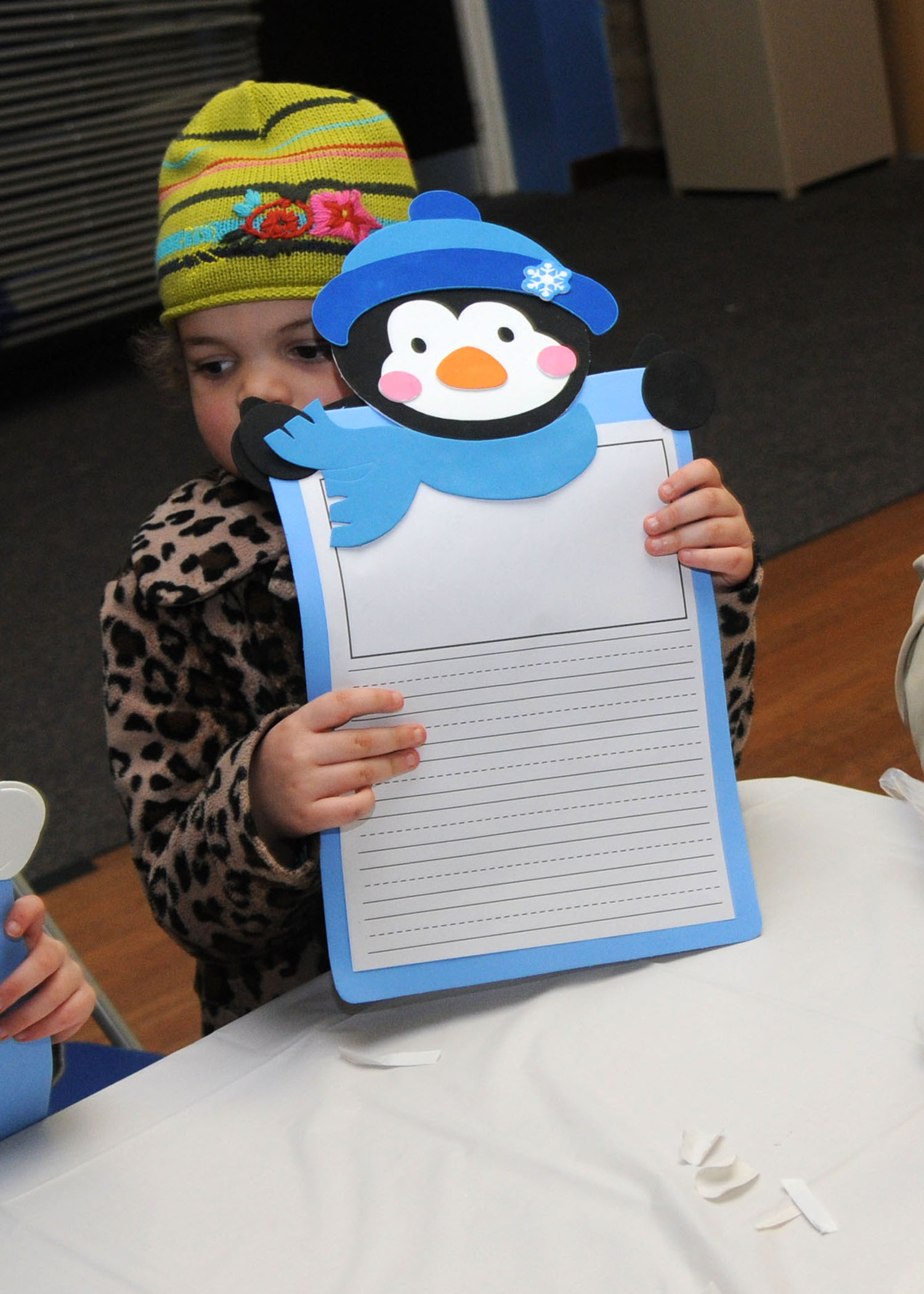Amelia King, 5, daughter of Tech. Sgt. Keegan King, from 100th Logistics Readiness Squadron supply section, holds up a winter story craft Dec. 18, 2012, at the Bob Hope Community Center at RAF Mildenhall, England. Hosted by the community center, the event gave families the chance to make some holiday-themed ornaments and crafts. (U.S. Air Force photo by Airman 1st Class Kelsey Waters/Released)
