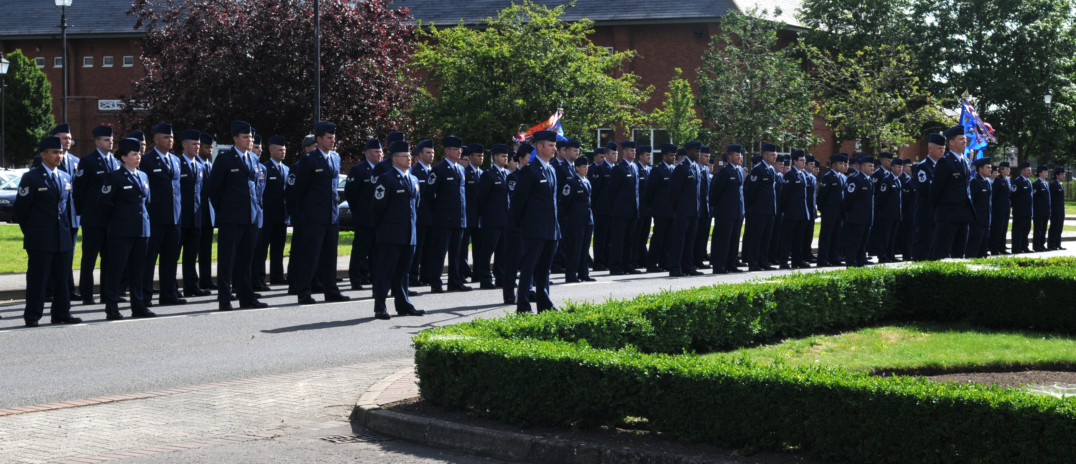 RAF MILDENHALL, England – Airmen from the 100th Air Refueling Wing staff agencies, 100th Operations Support Squadron, 351st Air Refueling Squadron and 727th Air Mobility Squadron stand at parade rest while waiting for retreat to sound in front of the 100th ARW headquarters building June 29, 2012. A retreat ceremony is held the last Friday of every month to honor and retire both the U.S. and Royal Air Force flags. (U.S. Air Force photo/Senior Airman Rachel Waller)