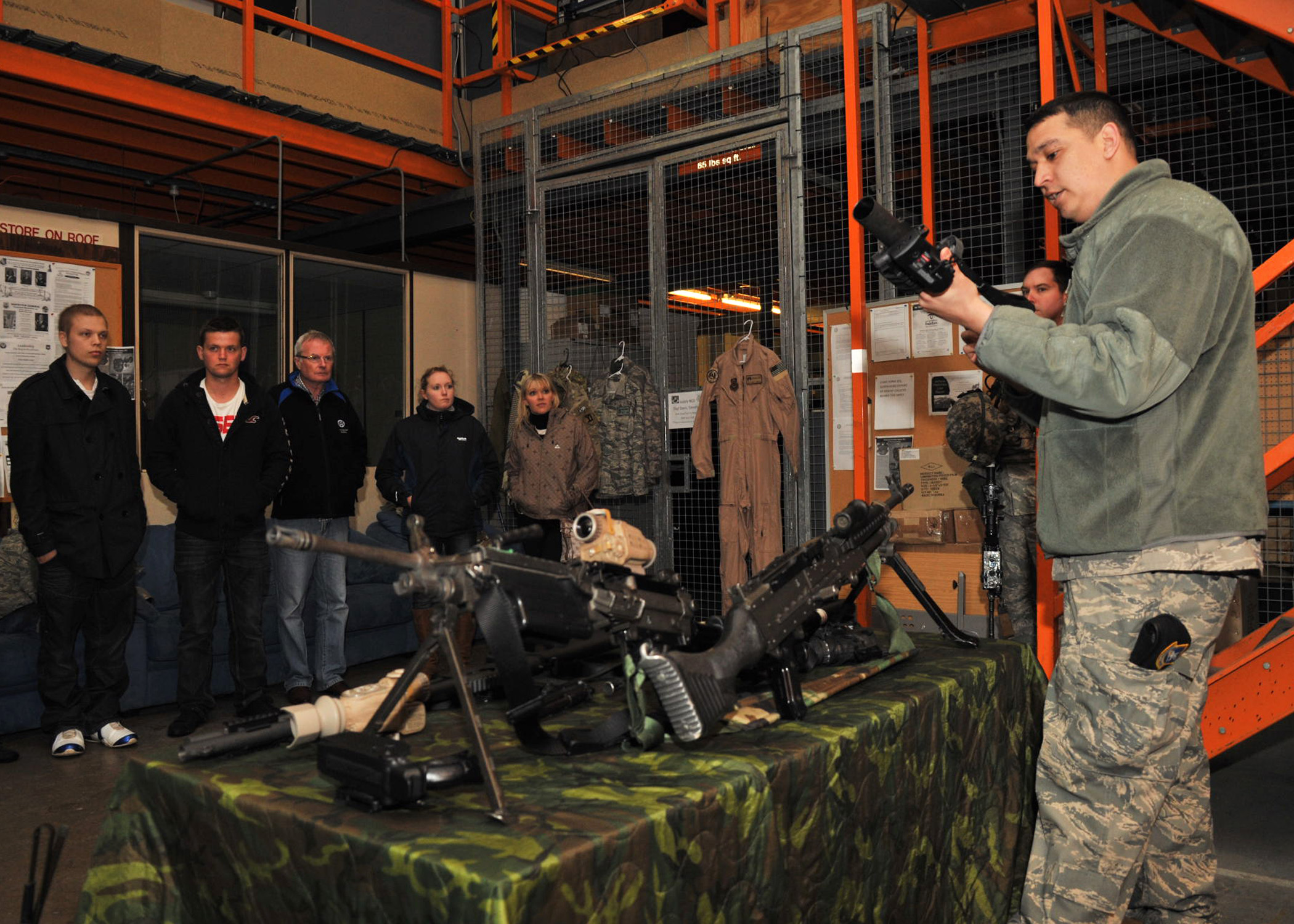 RAF MILDENHALL, England - Staff Sgt. James Herrera, 100th Security Forces Squadron, explains the uses and features of a few weapon systems during a tour for the Teenage Cancer Trust at the armory here April 4, 2012. The group was hosted by the 100th Communications Squadron and toured several base facilities including the fire department, the Air Traffic Control tower and the maintenance squadron. (U.S. Air Force photo/Senior Airman Jerilyn Quintanilla)