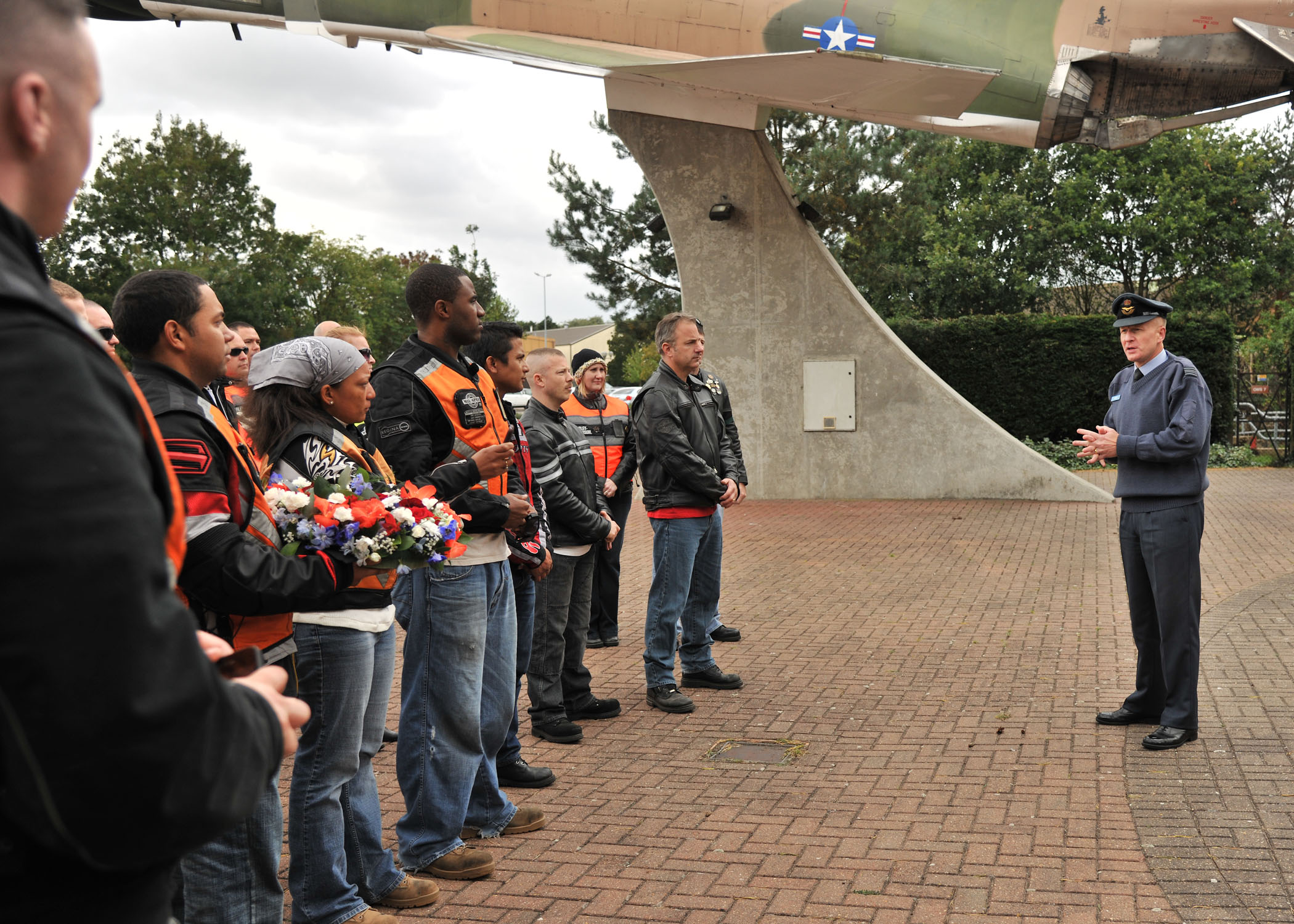 RAF MILDENHALL, England – Squadron Leader Rick Fryer, RAF Mildenhall Station commander, addresses Airmen participating in the Prisoner of War/Missing in Action Rolling Thunder Remembrance Motorcycle Ride at Memorial Park on RAF Lakenheath Sept. 13, 2011. As part of POW/MIA Remembrance week, the 100th Air Refueling Wing is hosting several events including a luncheon and base retreat ceremony. (U.S. Air Force photo by Senior Airman Jerilyn Quintanilla)
