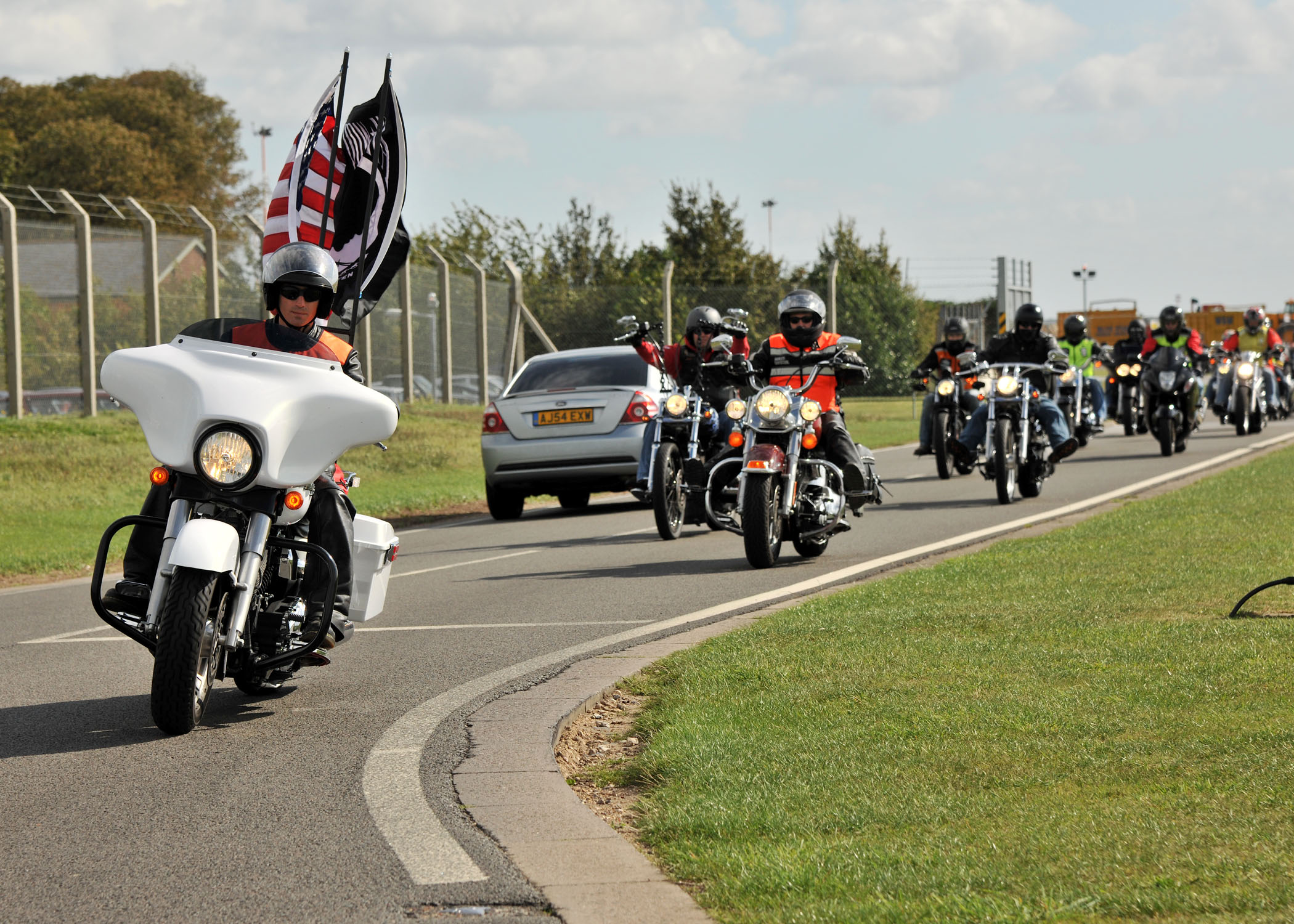 RAF MILDENHALL, England – Tech. Sgt Jonathan Richichi, 48th Communications Squadron, RAF Lakenheath, leads the Prisoner of War/Missing in Action Rolling Thunder Remembrance Motorcycle Ride here Sept. 13, 2011. The motorcycle ride began with the placing of a wreath at the POW/MIA memorial here and ended with the placing of another wreath at Memorial Park on RAF Lakenheath. (U.S. Air Force photo Senior Airman Jerilyn Quintanilla)
