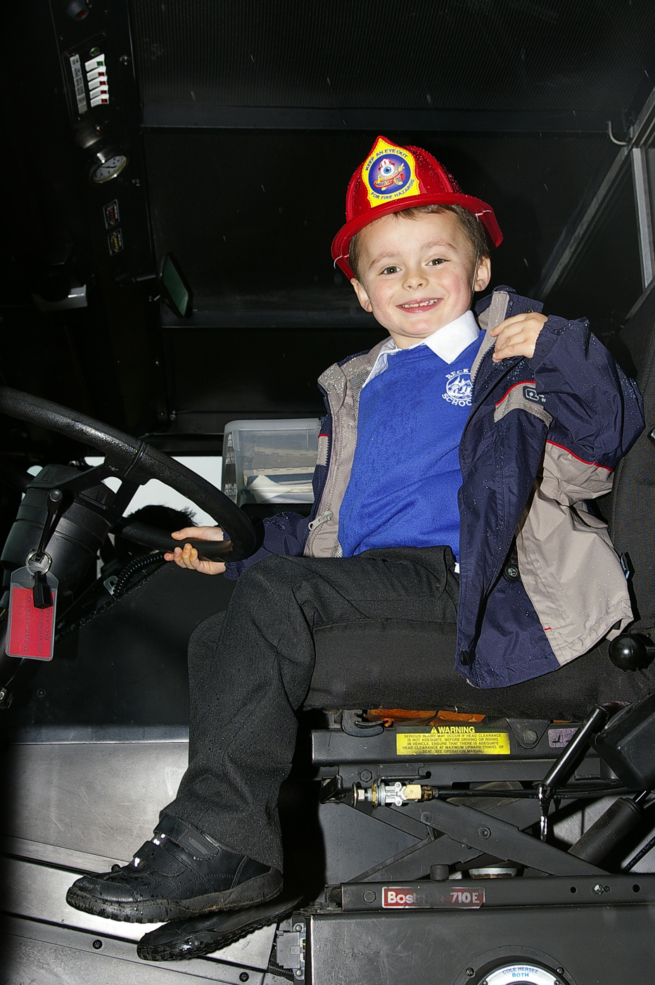 Jackson Sullivan, 4, from France Class at Beck Row Primary School, checks out the driver's seat of a fire truck from the RAF Mildenhall Fire Department Oct. 9. Sparky the Fire Dog and two firefighters from RAF Mildenhall visited the primary school as part of Fire Prevention Week activities. (U.S. Air Force photo by Karen Abeyasekere)