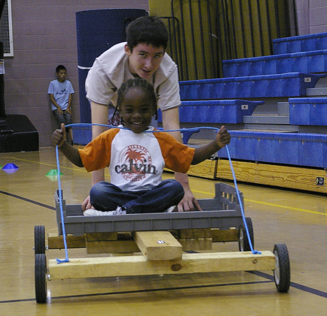 Julius Pullen, 4, tries his hand at carting, with the help of Jordan Strickland, at the youth center Sept. 15 during the Day for Kids event. (U.S. Air Force photo by Karen Abeyasekere)