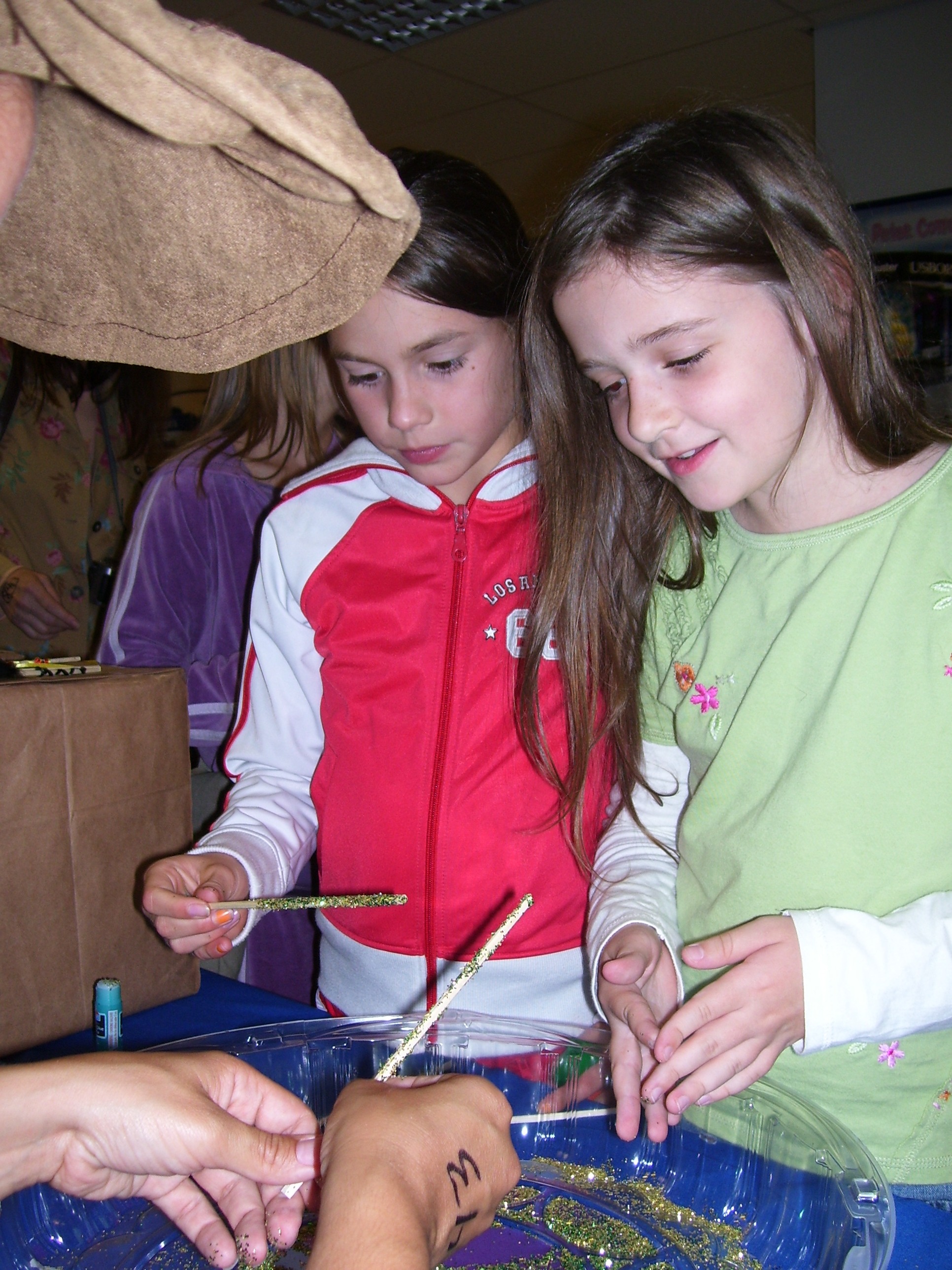Kelsey Vondenstein, left, and Haley Janes get some assistance making wands during the Harry Potter and the Deathly Hallows release party at the RAF Mildenhall BookMark July 20. (U.S. Air Force photo by Laurie Janes)