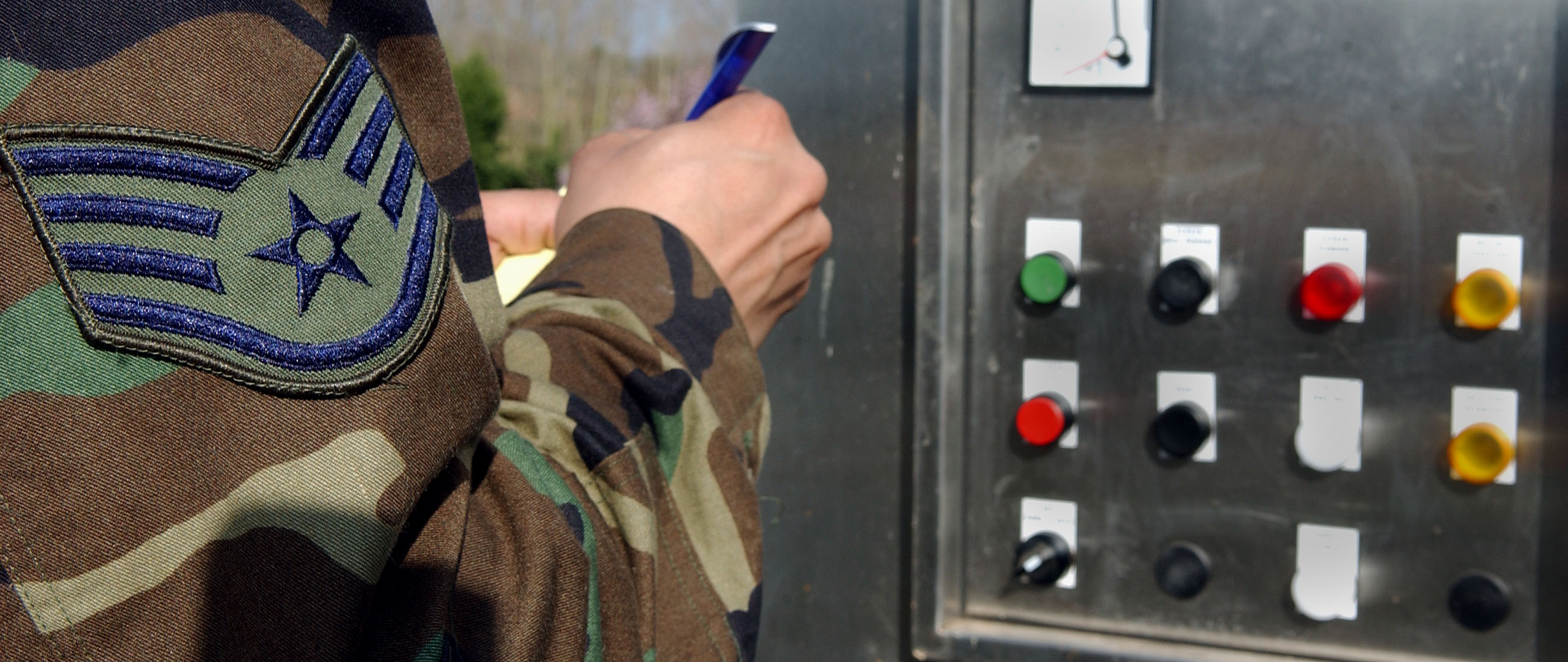 Staff Sgt. Jason Sublett, 100th Civil Engineer Squadron, Utilities Flight, completes a meter reading to determine the run time of the water pumps. The pumps advance waste from sewerage water through a filtration system. (U.S. Air Force photo by Staff Sgt. Tyrona Pearsall)