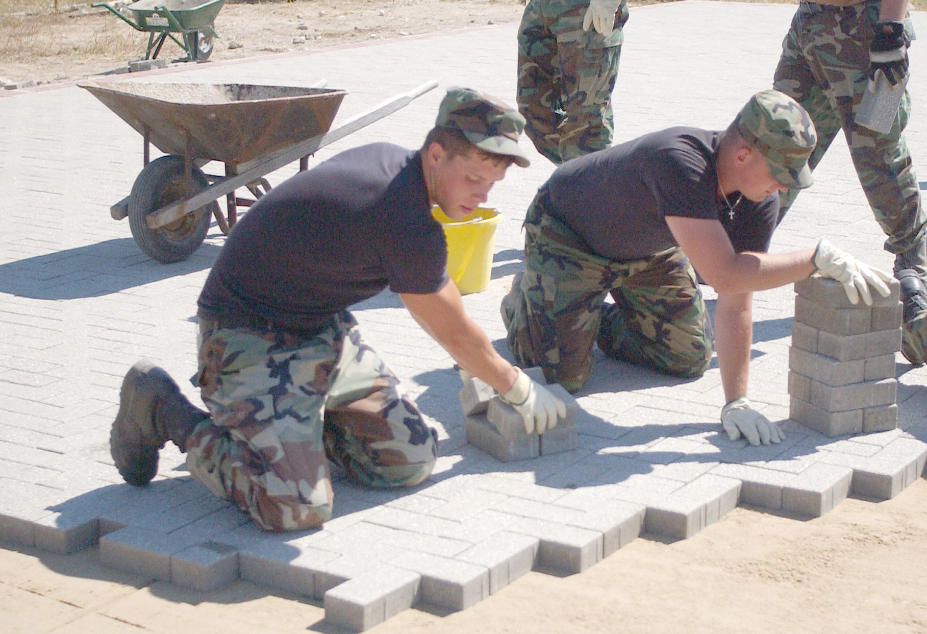 Senior Airman Jared LeMasters, and Senior Airman Zack Novotny, both of the 132nd Civil Engineer Squadron out of Des Moines, Iowa, lay a brick foundation at the site of a future sports facility which will be located behind the Hardstand Gym and Wellness Center. (U.S. Air Force photo by Michael Clements)