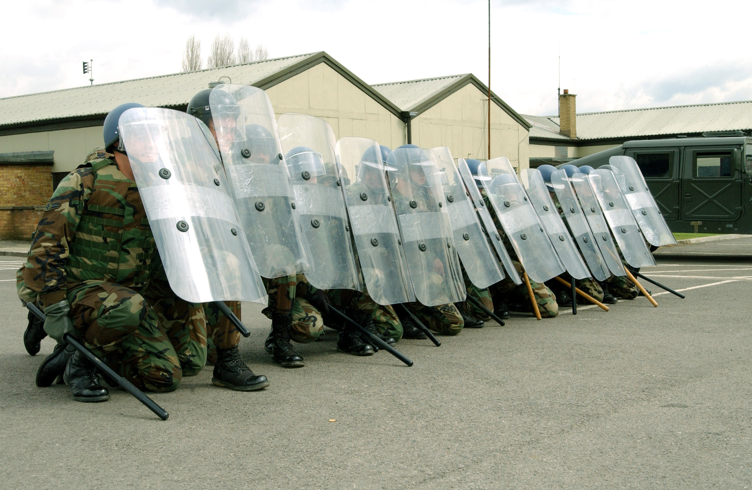 ROYAL AIR FORCE FAIRFORD, England - Airmen from the 100th Security Forces Squadron receive training on confrontational management skills here April 8. The training emphasizes the importance of riot control. The 100th SFS is from Royal Air Force Mildenhall, England. (U.S. Air Force photo by Senior Airman Stacia M. Willis)