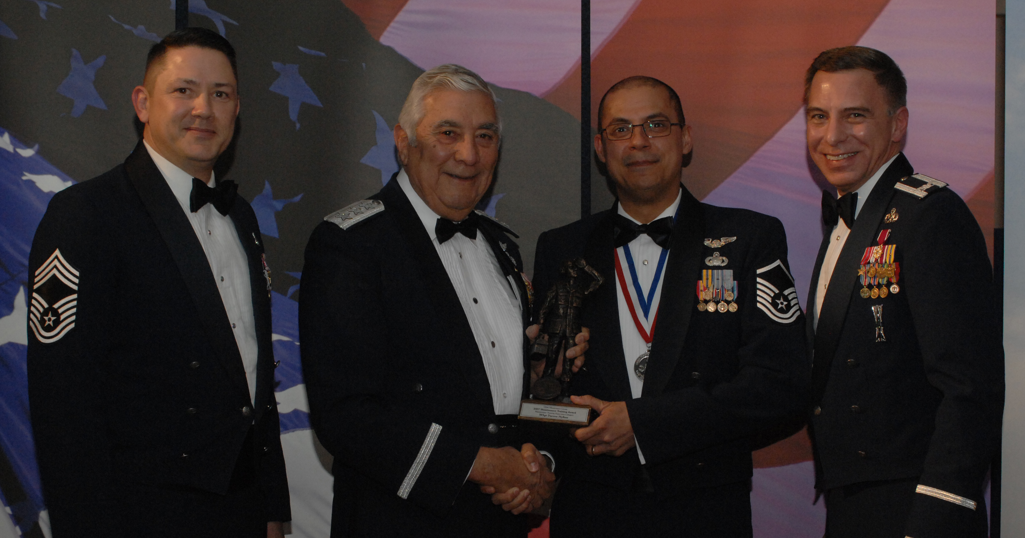 Maintenance Training Flight Supervisor (from left) Chief Master Sgt. Gregory Blue, 100th Maintenance Group chief enlisted manager; Lt. Gen. Leo Marquez; Master Sgt. Darren Hylton, 100th Maintenance Operations Squadron and award recipient; and Col. Michael Seville, 100th Maintenance Group commander. (U.S. Air Force photo by Airman 1st Class Brad Smith)