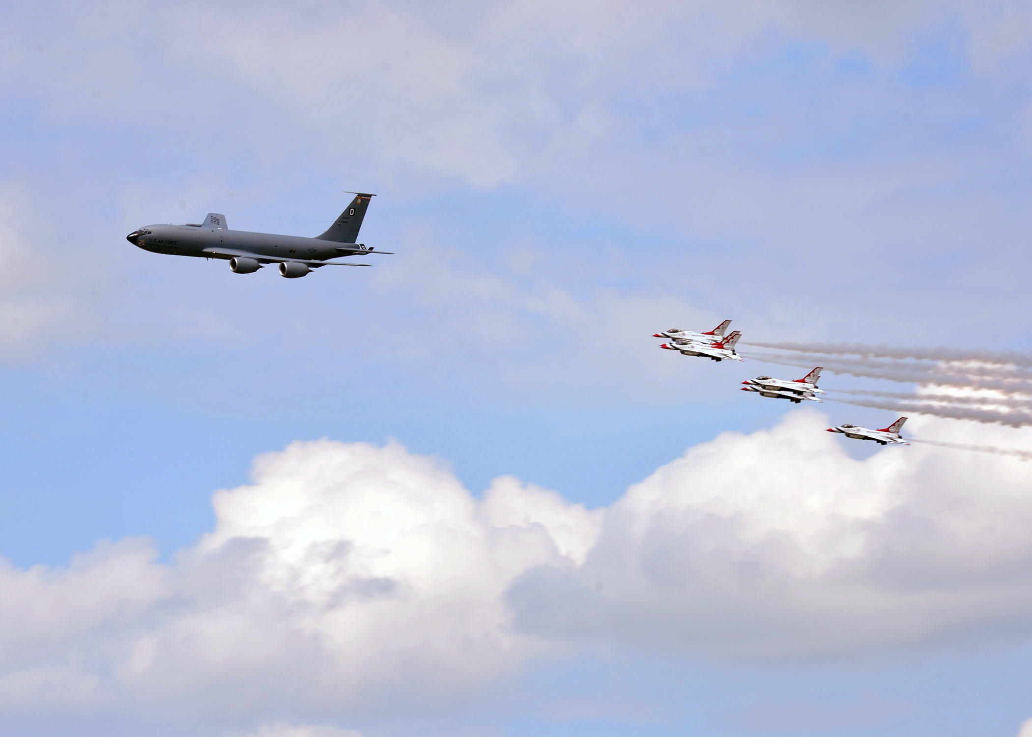 The U.S. Air Force Thunderbirds fly in formation over RAF Mildenhall and RAF Lakenheath, England, July 10, 2017. The Thunderbirds were led by a U.S. Air Force KC-135 Stratotanker assigned to the 100th Air Refueling Wing for air refueling on their way to northern Scotland. (U.S. Air Force photo by Karen Abeyasekere)