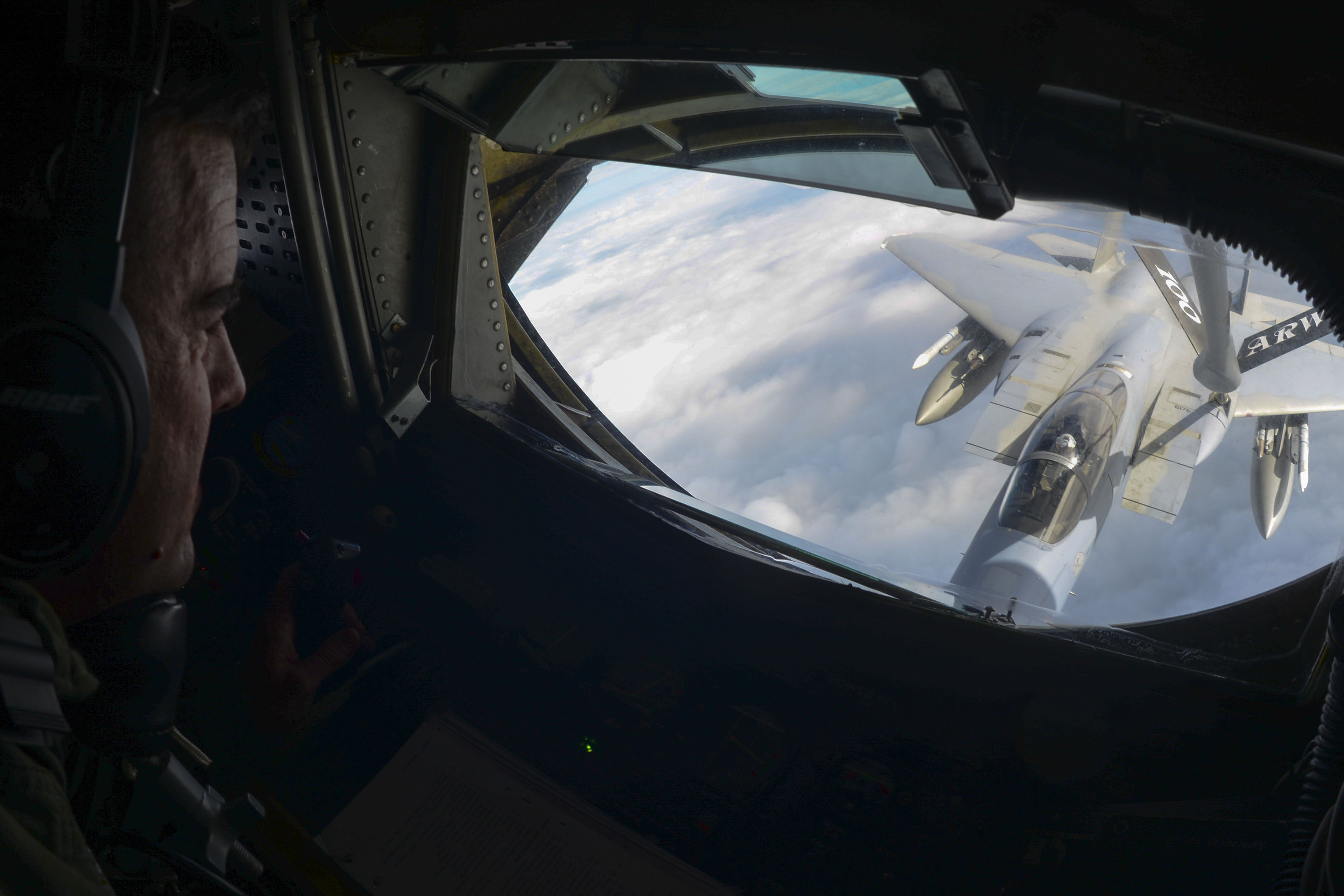 U.S. Air Force Master Sgt. Robert King, 351st Air Refueling Squadron boom operator and NCO in charge of training, makes a contact with an F-15C Eagle form the 493rd Fighter Squadron, RAF Lakenheath, Sept. 8, 2017, over the Northeast coast of England. The aircraft were part of a formation flight over the U.K. Formation flights can include multiple tankers to fuel receivers, while reserving enough gas to fly further distances. (U.S. Air Force photo by Senior Airman Justine Rho)